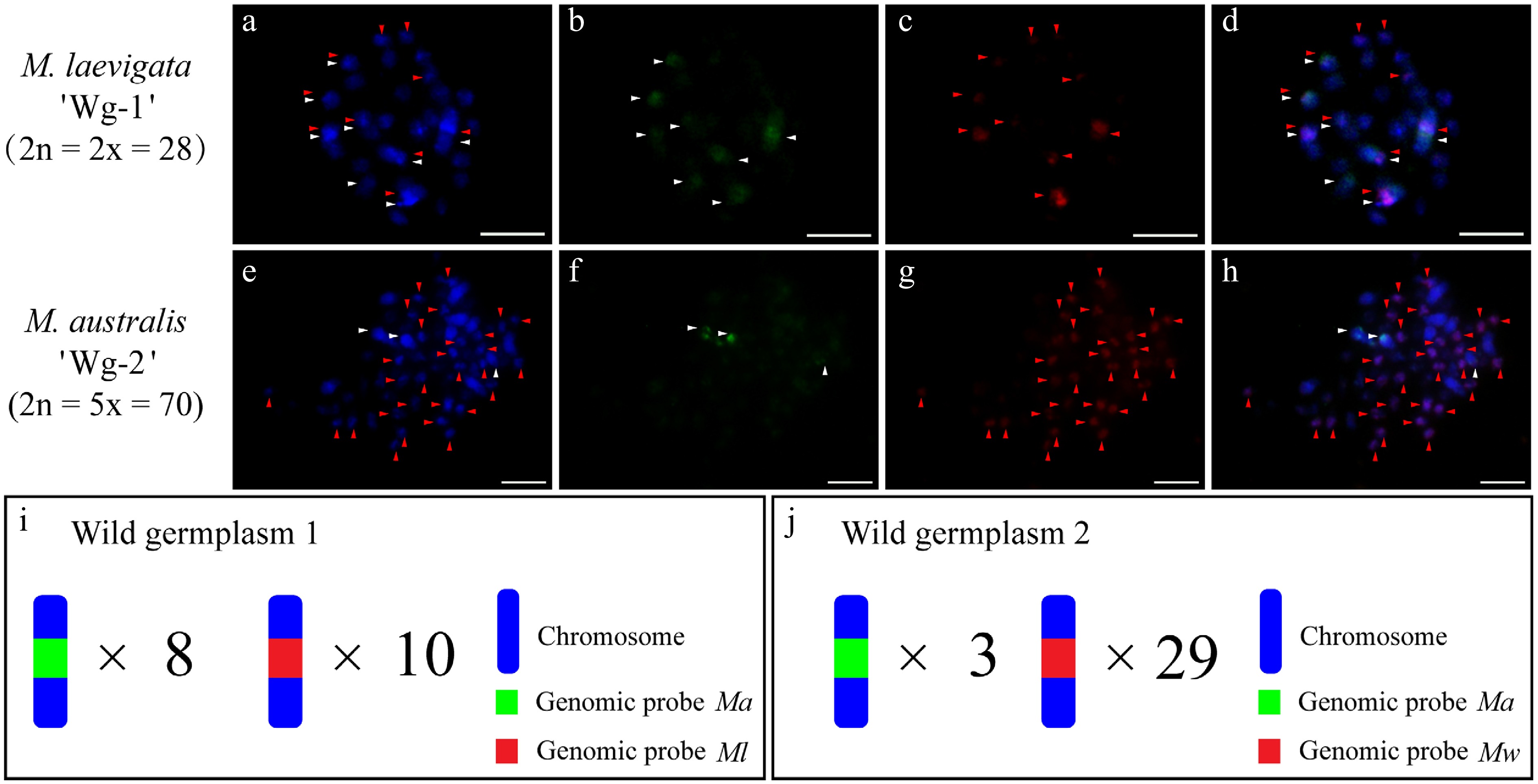 cGISH signal patterns in the wild accessions M. laevigata 'Wg-1' and M. australis 'Wg-2'. (a)−(d) The two-round cGISH signals using genomic probes from Ma (green) and Ml (red) with reciprocal blocking DNA were detected in M. laevigata 'Wg-1'. (e)−(h) Corresponding two-round cGISH signals using genomic probes from Ma (green) and Mw (red) with reciprocal blocking DNA were detected in M. australis 'Wg-2'. (i), (j) Ideograms summarizing chromosome counts with different genomic probes' signals. White arrows point to chromosomes with Ma signals, whereas red arrows point to chromosomes with (a)−(d) Ml signals or (e)−(h) Mw signals. Scale bars represent 5 μm.