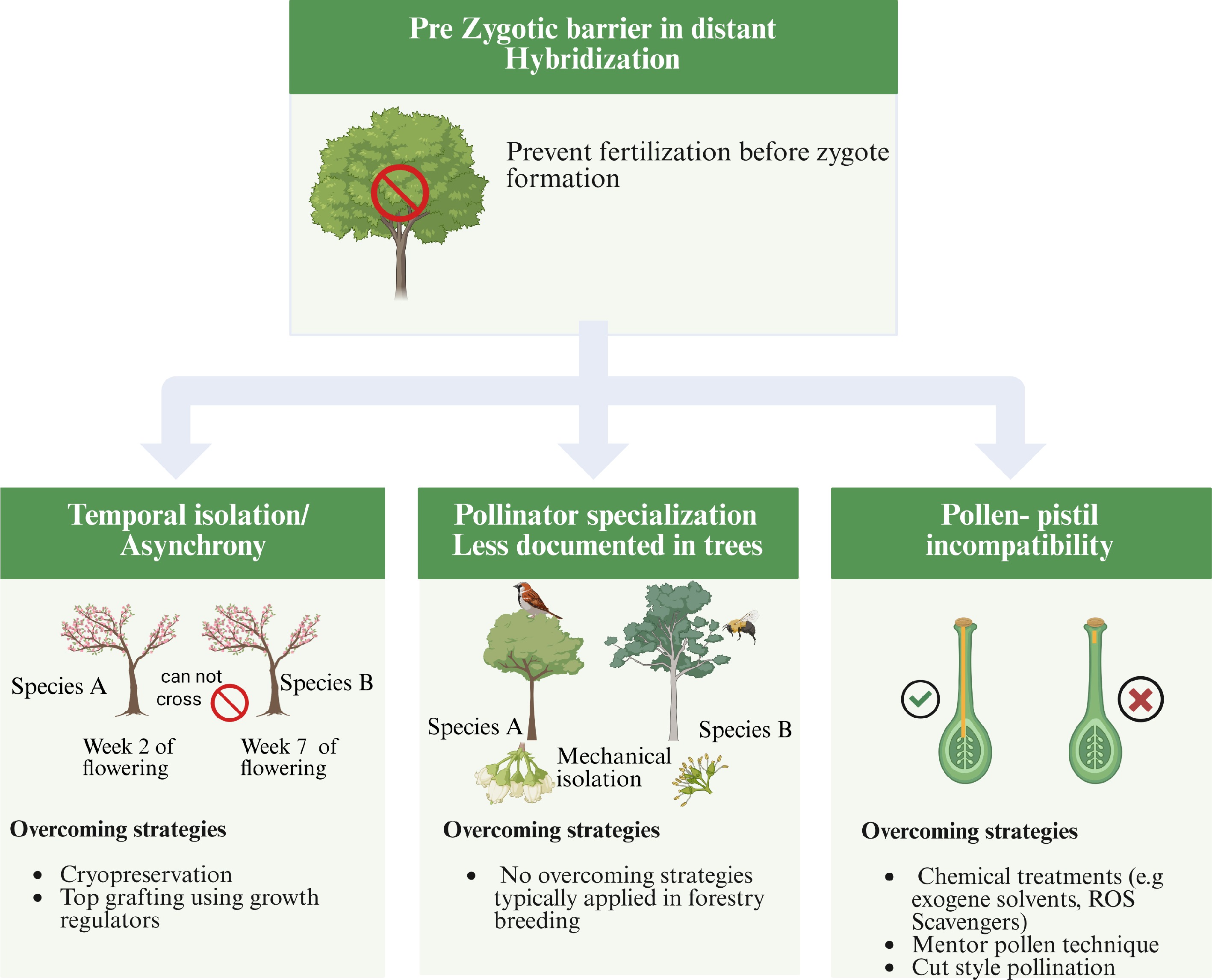 Schematic illustration of major pre-zygotic barriers encountered in distant hybridization of forest trees, including temporal isolation/asynchrony, pollen–stigma incompatibility, and mechanical isolation. Each barrier prevents fertilization before zygote formation and limits hybrid success. Strategies such as controlled pollination, hormonal treatment, and style manipulation are used to overcome these reproductive obstacles and facilitate successful hybrid formation.