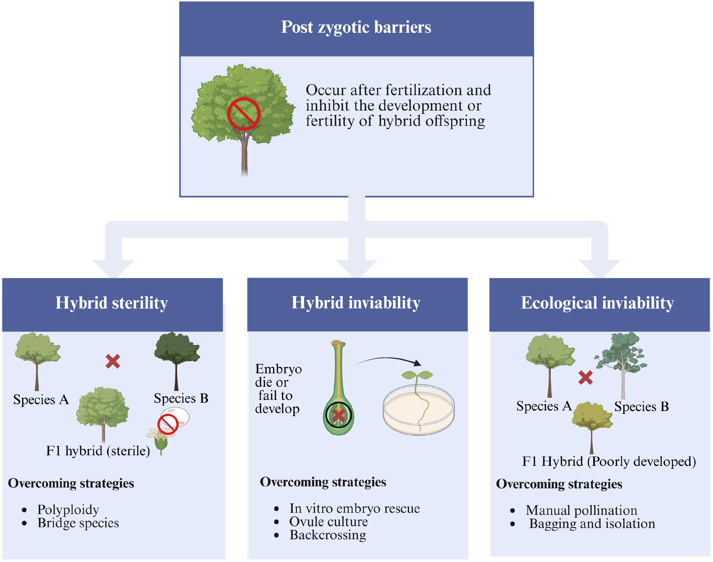 Conceptual framework illustrating major post-zygotic barriers encountered in distant hybridization of forest tree species. The figure highlights three primary forms: (1) Hybrid sterility, where F1 hybrids are unable to produce viable gametes; (2) Hybrid inviability, characterized by embryo abortion or failure to develop; and (3) Ecological inviability, where hybrids are maladapted to environmental conditions. Associated strategies to overcome these barriers include polyploidization, embryo rescue, and ecological modeling approaches aimed at improving hybrid establishment and performance.