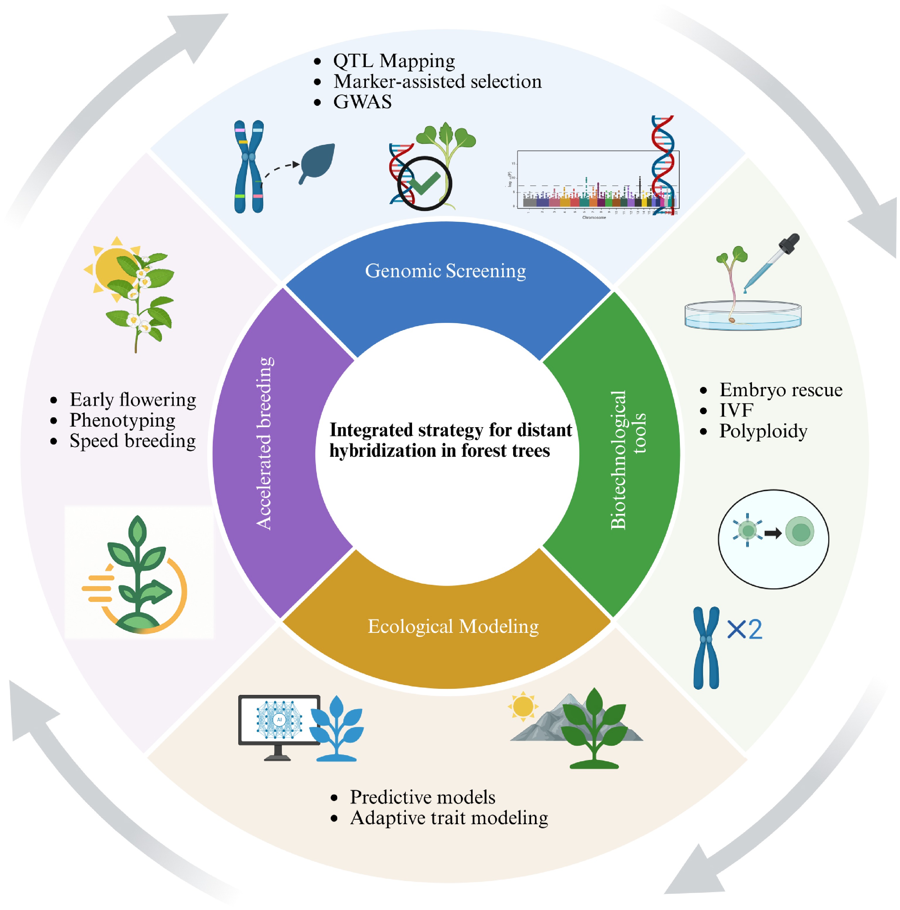 Integrated strategy for distant hybridization in forest trees. This schematic outlines a multidisciplinary approach combining genomic screening (e.g., QTL mapping, GWAS, marker-assisted selection), biotechnological tools (e.g., embryo rescue, in vitro fertilization, polyploidy induction), ecological modeling (e.g., predictive and adaptive trait modeling), and accelerated breeding (e.g., early flowering, phenotyping, speed breeding). Together, these strategies enhance the success and efficiency of distant hybridization efforts in forest tree improvement programs.