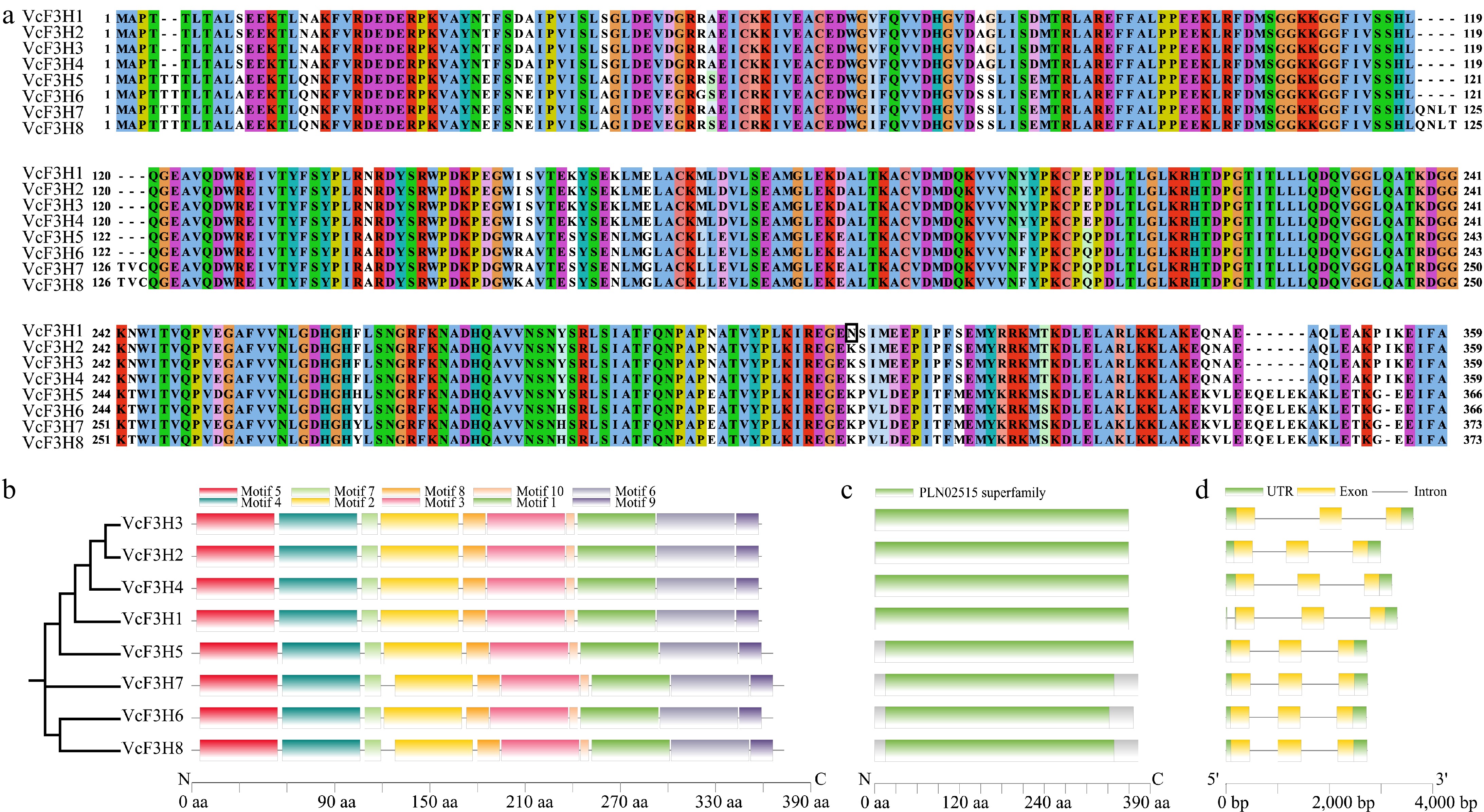 (a) Sequence alignment, (b) conserved motifs, (c) domain, and (d) gene structure analysis results of the eight anthocyanin-related VcF3Hs identified in blueberry.