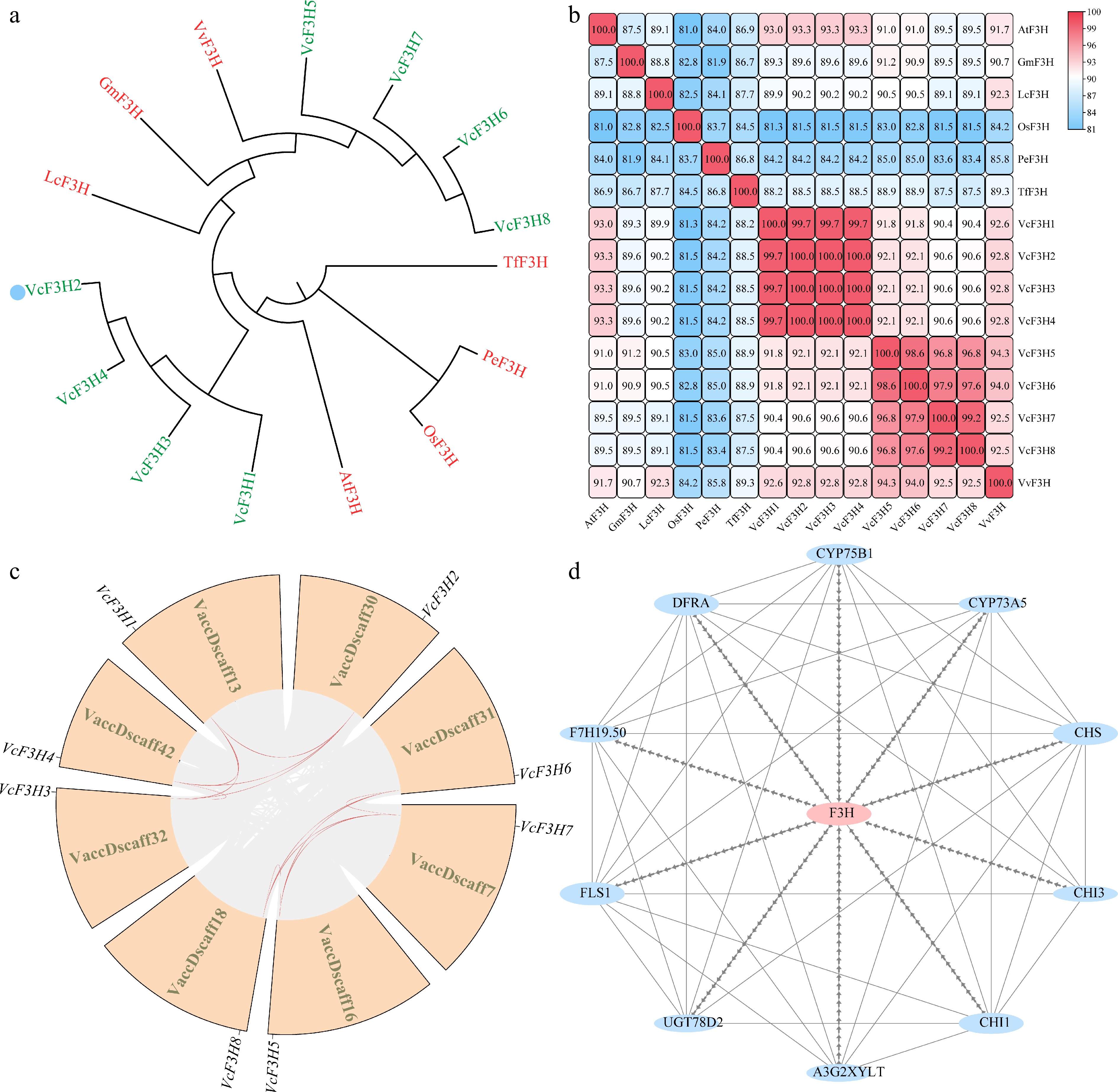 (a) Phylogenetic, (b) similarity, (c) synteny, and (d) interacting protein analysis results of VcF3Hs.