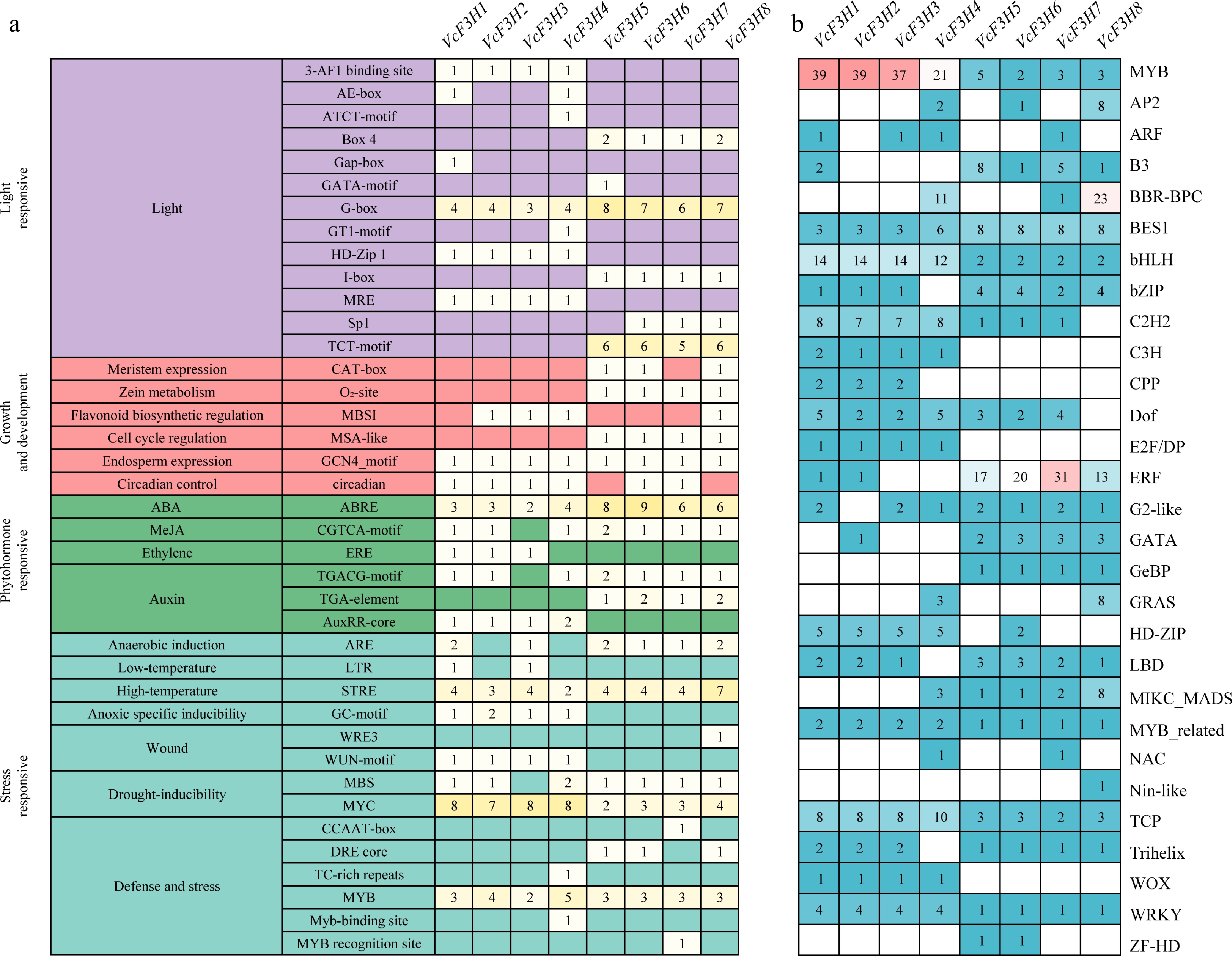 Predicted (a) cis-acting elements, and (b) transcription factor binding sites in promoters of VcF3H.