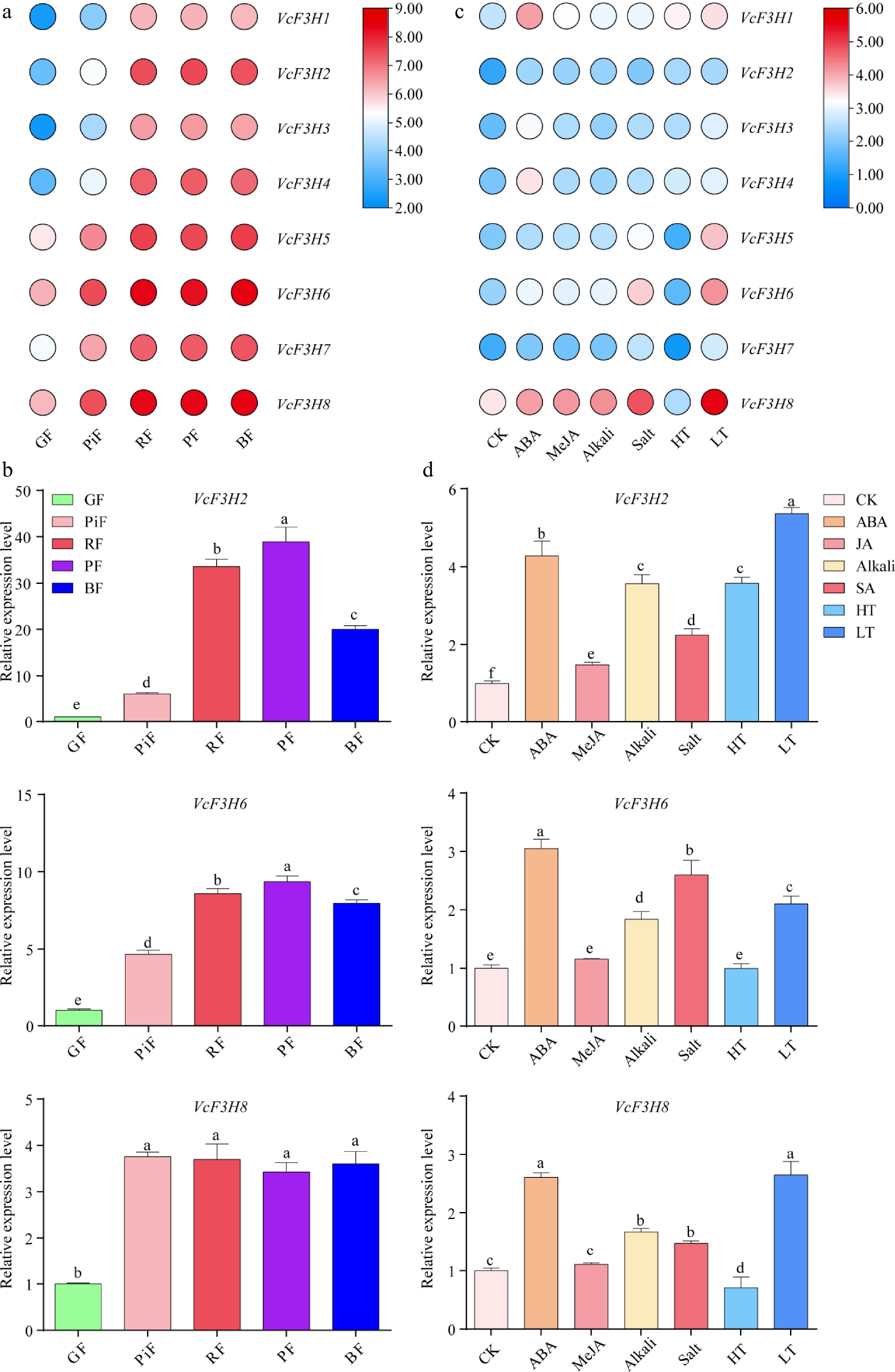 Gene expression analysis results of VcF3Hs in (a), (b) fruits at five different ripening stages, and (c), (d) in leaves treated with different phytohormones and abiotic stresses. (a) and (c) are transcriptome data analysis results. The Log2 (FPKM + 1) value is used for heatmap drawing. The redder the color, the higher the gene expression, and the bluer the color, the lower the gene expression. (b) and (d) are qRT-PCR analysis results. Different letters above columns represent a significant difference at the p < 0.05 level. GF: green fruit; PiF: pink fruit; RF: red fruit; PF: purple fruit; BF: blue fruit; CK: nontreated control leaf; ABA, MeJA, Alkali, Salt, HT, and LT represents leaf treated with 100 mM ABA, 100 mM MeJA, 200 mM NaCl, and Na2SO4, 200 mM NaHCO3 and Na2CO3, 4 °C low temperature and 40 °C high temperature, respectively.