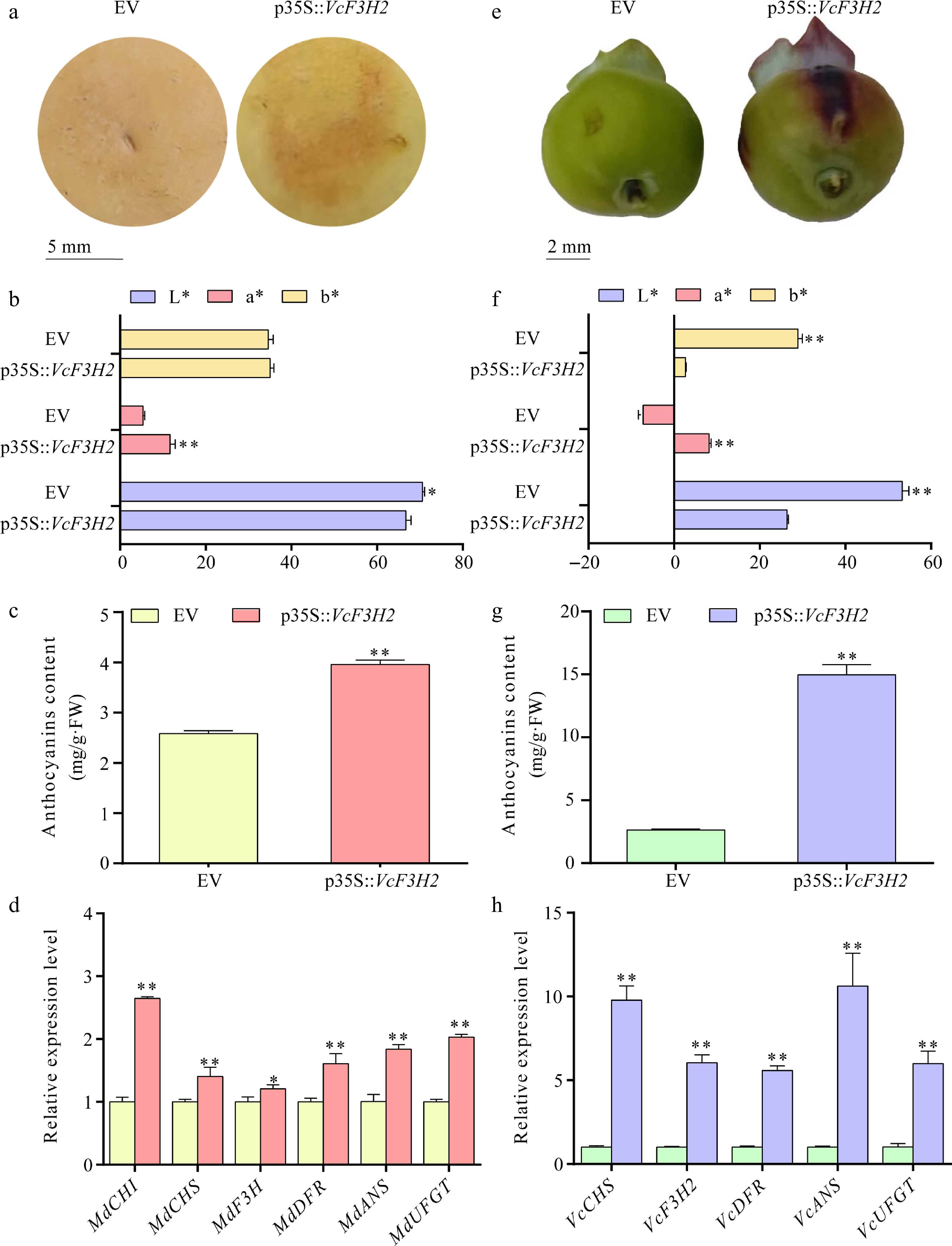 The influences of VcF3H2 overexpression in anthocyanins biosynthesis and expression of corresponding structural genes in apple and blueberry fruits. (a) Transient overexpression of VcF3H2 promoted anthocyanins accumulation in apple peel; (b)−(d) Effects of overexpression of VcF3H2 on color parameters, anthocyanins content and expression of anthocyanins biosynthesis structural genes in apple peels. (e) Transient overexpression of VcF3H2 promoted anthocyanins accumulation in blueberry fruit peels; (f)−(h) Effects of overexpression of VcF3H2 on color parameters, anthocyanin content, and expression of anthocyanin biosynthesis structural genes in blueberry fruit peels. Data were presented as the means ± standard deviations of three biological replicates, with asterisks showing significant differences (*, p < 0.05; **, p < 0.01). In (b) and (f), L* indicates lightness from 0 (black) to 100 (white); a* indicates red/green (+a* = redder, −a = greener); b* indicates yellow/blue (+b* = yellower, −b* = bluer).