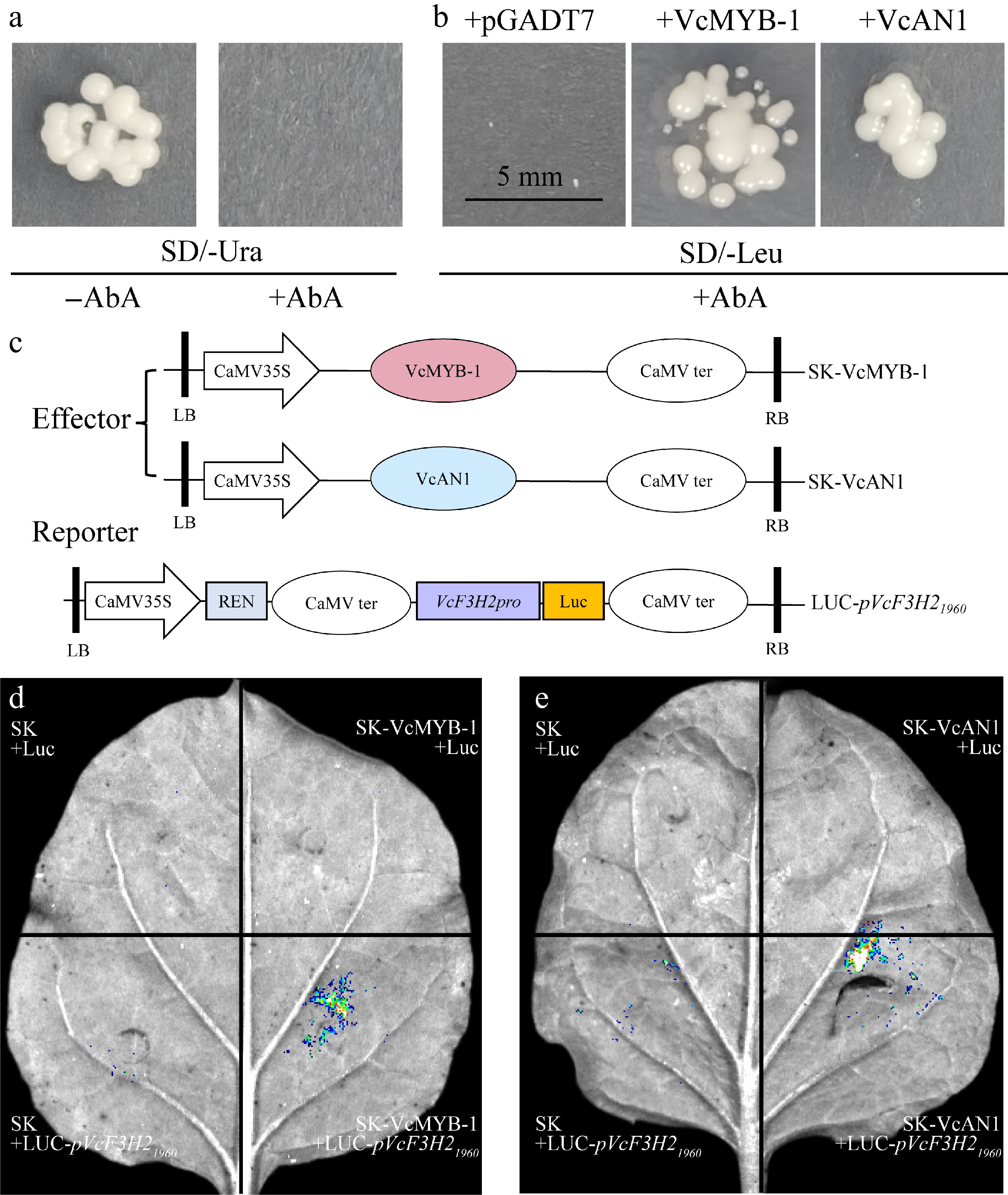 Regulation of VcMYB-1 and VcAN1 on VcF3H2 promoter. (a) Self-activation verification of the VcF3H2 promoter. AbA: Aureobasidin A. (b) Y1H validation results. (c) Schematic diagrams for the effector and reporter constructs used for LUC; REN: Renilla luciferase. The stop codon removed CDS sequences of VcMYB-1 and VcAN1 were inserted into the pNC-Green-SK vector to generate effector constructs. The 1960 bp VcF3H2 promoter sequence was cloned into pNC-Green-Luc vector to generate the reporter construct (LUC-pVcF3H21960). LB: left border; RB: right border. (d) and (e) LUC imaging results for the binding and activation abilities of VcMYB-1 and VcAN1 on the VcF3H2 promoter, respectively.