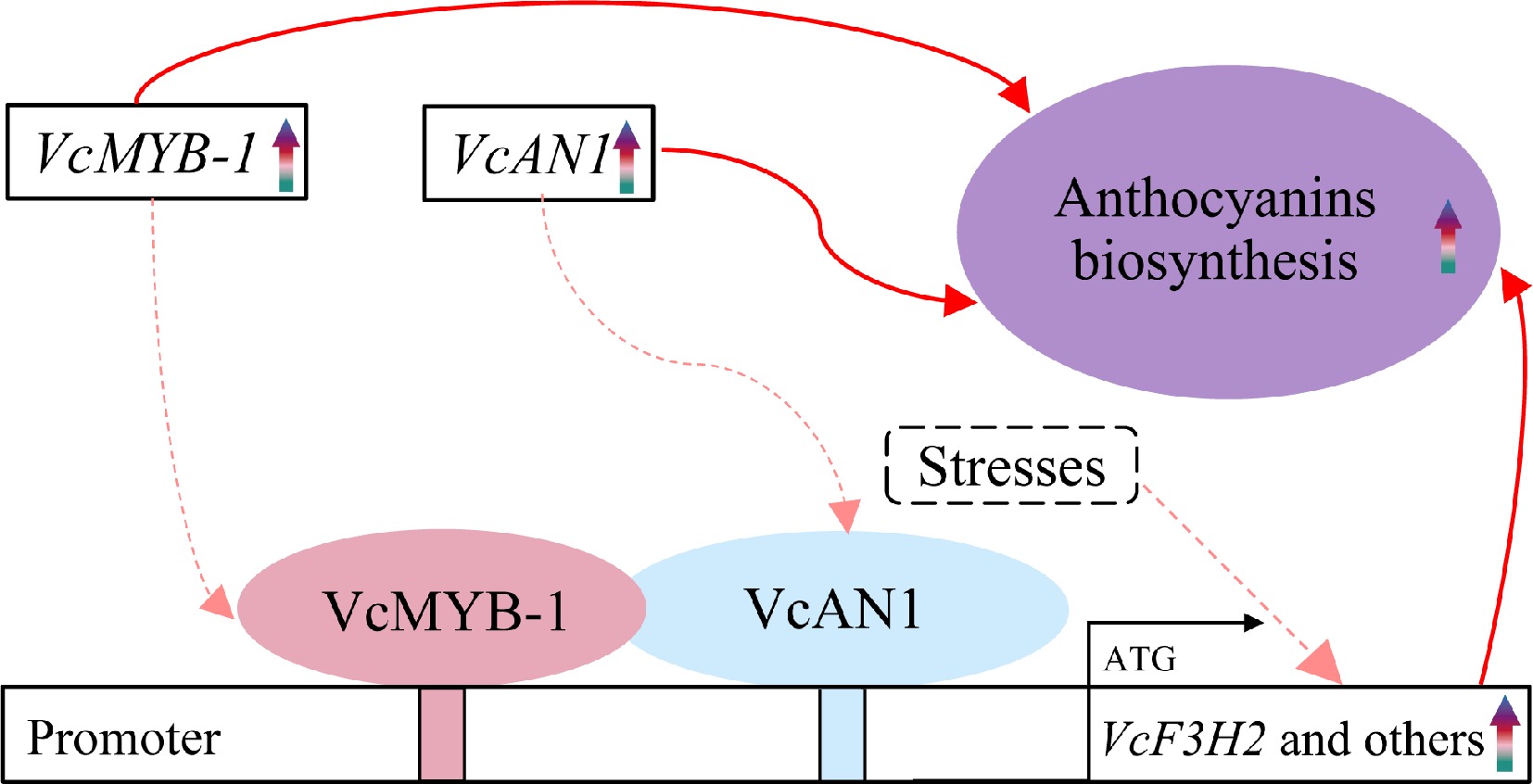 The 'VcMYB/VcAN1-VcF3H2' module in regulating anthocyanin biosynthesis in blueberry. Rainbow arrows represent upregulation or increase during fruit ripening. Red arrows represent promoting effects. Solid arrows represent results have been validated in this study or previous studies, and dotted arrows represent results that need to be further confirmed.