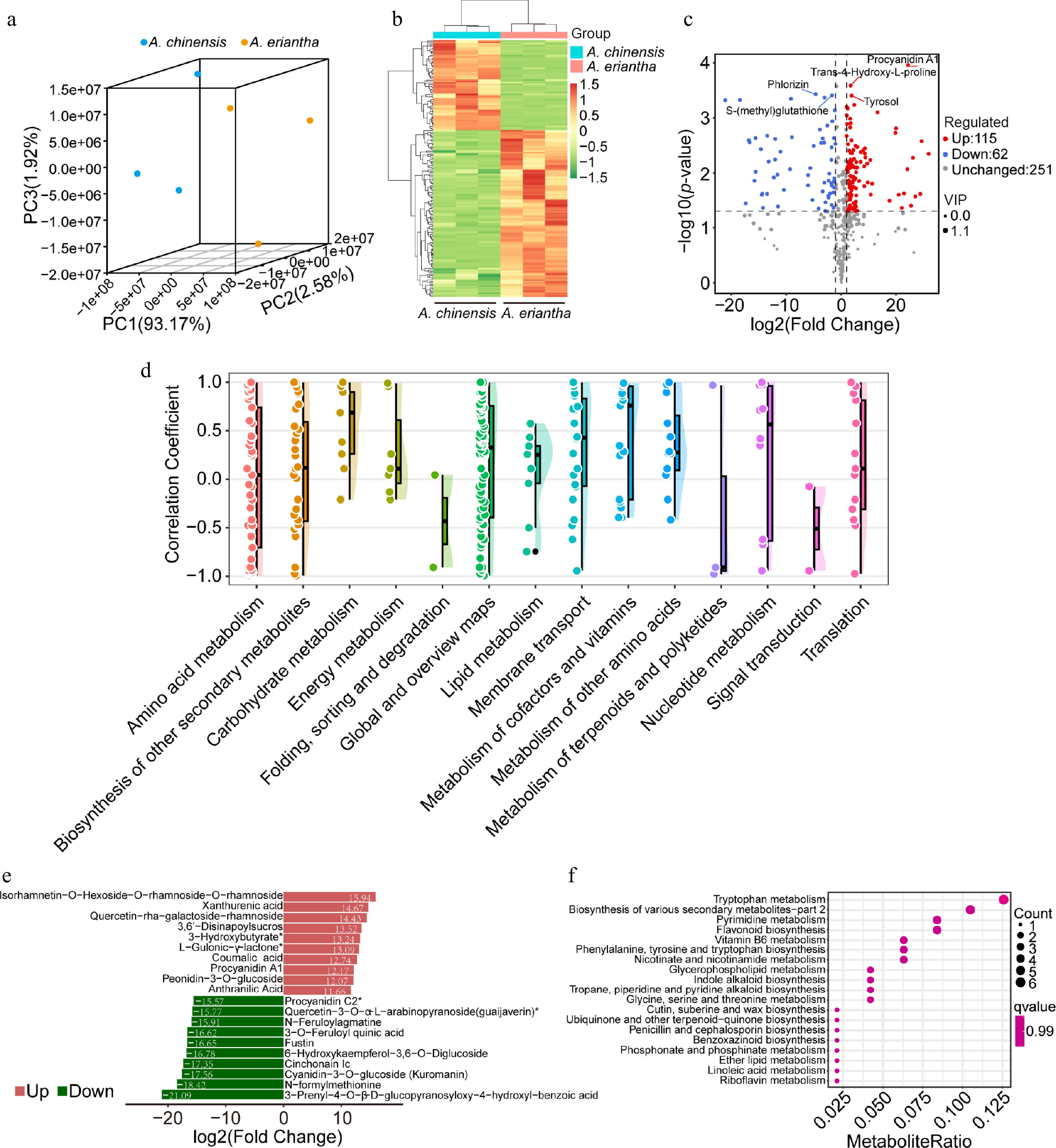Analysis of metabolites in A. chinensis and A. eriantha fruits. (a) Clustering of all fruit samples using Principal Component Analysis (PCA). (b) Hierarchical cluster-based heatmap of differential metabolites detected in fruit samples. (c) Volcano plot illustrating the identified differentially accumulated metabolites (DAMs). (d) Correlation coefficients of metabolites content patterns in ripening fruit shared by A. chinensis and A. eriantha. (e) Top 10 upregulated and downregulated metabolites based on log2(Fold Change). (f) Enriched components based on KEGG analysis of all DEGs.
