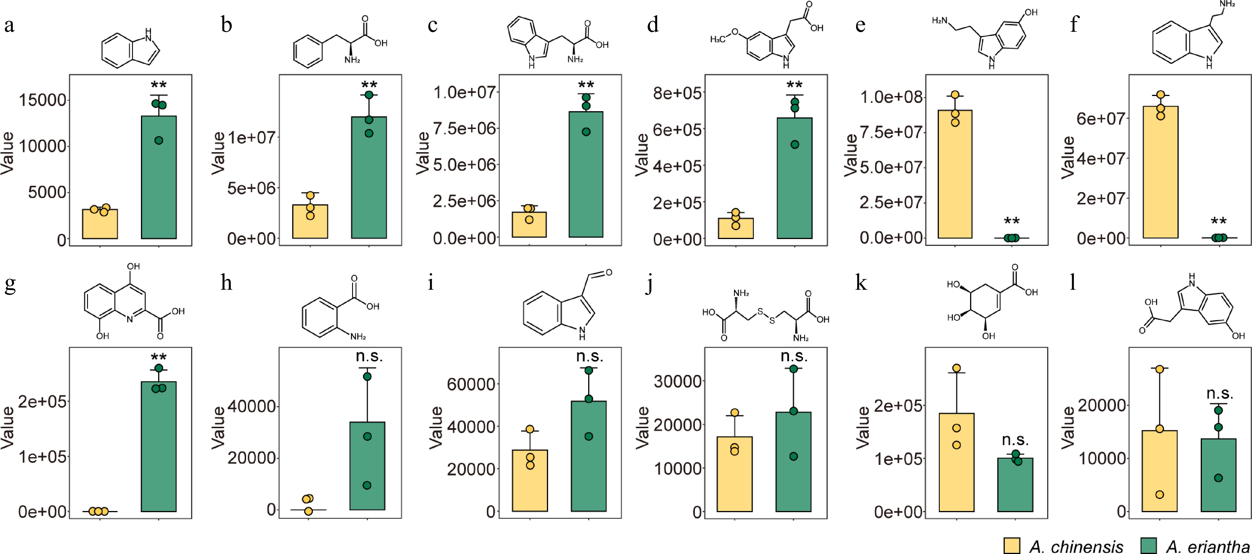Contents of differentially accumulated metabolites (DAMs) associated with the tryptophan metabolism pathway in A. chinensis and A. eriantha fruits. (a) Indole, (b) L-phenylalanine, (c) L-tryptophan, (d) methoxyindoleacetic acid, (e) serotonin, (f) tryptamine, (g) xanthurenic acid, (h) anthranilic acid, (i) indole-3-carboxaldehyde, (j) L-(-)-cystine, (k) shikimic acid, and (l) 5-hydroxyindole-3-acetic acid. ** p < 0.01, n.s. non-significance.