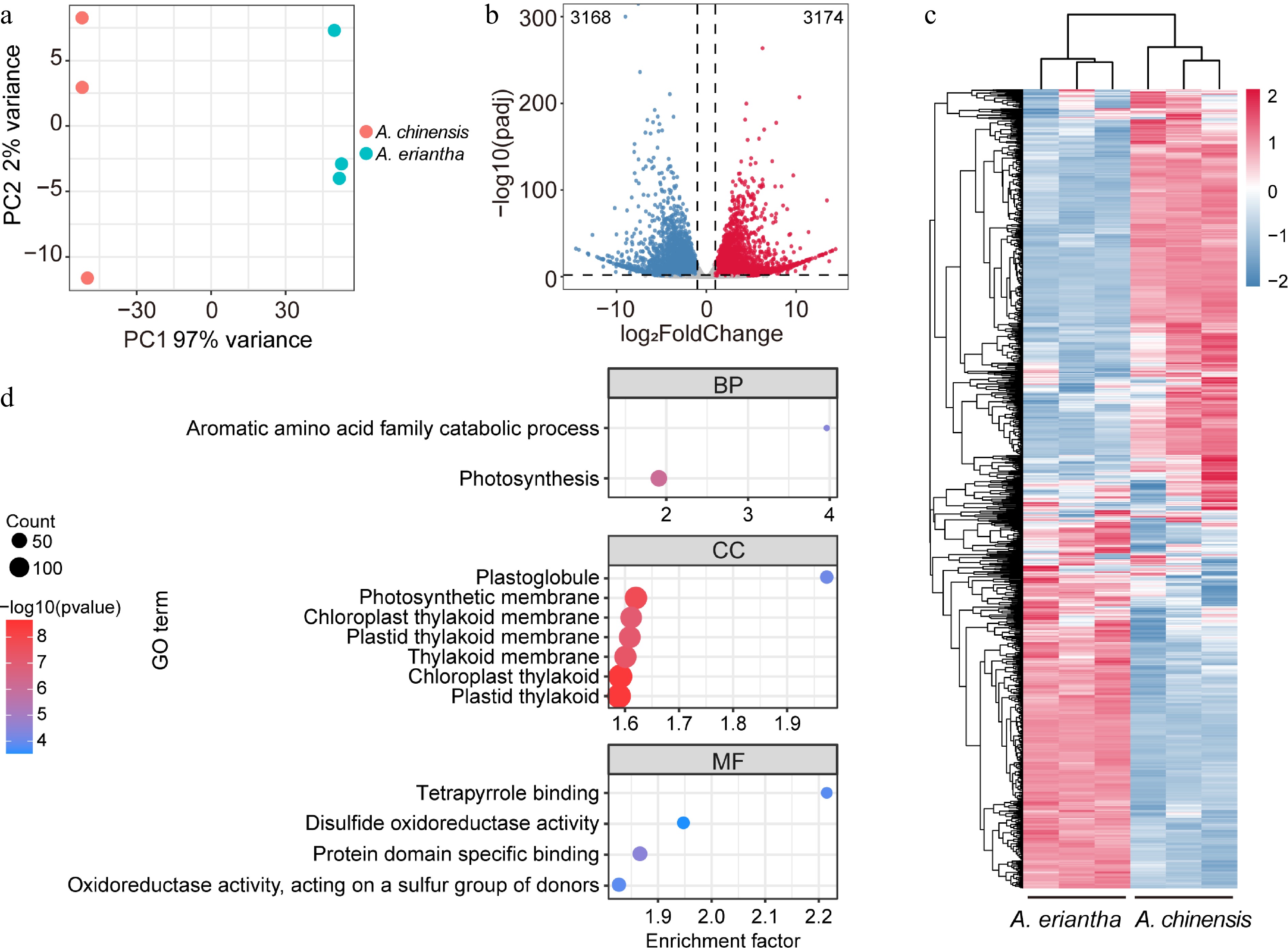 Transcriptome dynamics of fruit samples for A. chinensis and A. eriantha. (a) Clustering of all fruit samples subjected to transcriptome analysis using Principal Component Analysis (PCA). (b) A volcano plot displaying the up-and downregulated differentially expressed genes (DEGs) when comparing fruit samples between A. chinensis and A. eriantha. (c) Heatmap with scaled expression value of DEGs in fruit samples of A. chinensis and A. eriantha. (d) Enriched components according to GO analysis.