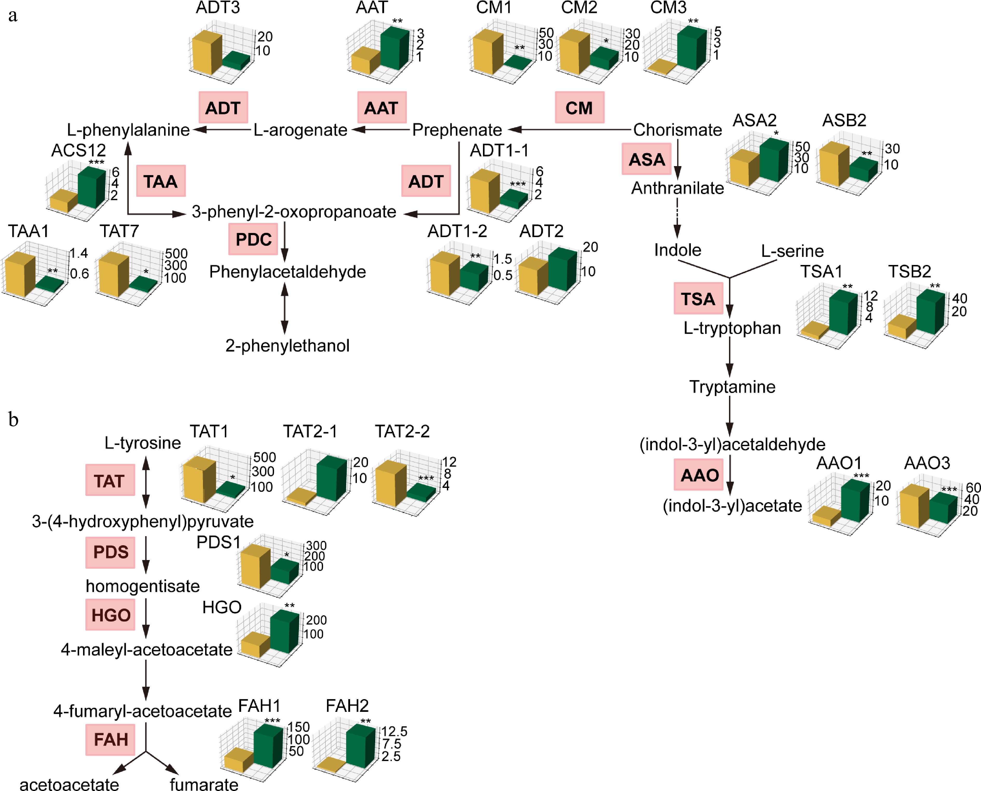 Amino acids are crucial not only for the ripening and development of fruits, but also as essential taste and nutrient elements[13,14]. Research has shown that the levels of the sweet amino acids proline and threonine increase progressively during the ripening of kiwifruit, potentially contributing more significantly to the fruit's sweetness compared to other amino acids[13]. Furthermore, aromatic amino acids (AAAs), are fundamental components of proteins. They function as precursors for a wide range of secondary metabolites, such as flavonoids, ligin, vitamin E, and others[15,16]. The primary synthesis pathway for AAAs occurs in plant plastids, via the shikimic acid pathway[17]. Precise regulation of this synthesis process is essential for maintaining optimal levels of AAAs, which is vital for promoting normal plant growth, reproduction, and enhancing their resilience to environmental stressors. Studies have indicated that aminotransferases in Arabidopsis participate in the synthesis and metabolism of AAAs, helping to maintain plant amino acid balance[18]. However, the metabolism of AAAs in kiwifruit remains poorly understood.