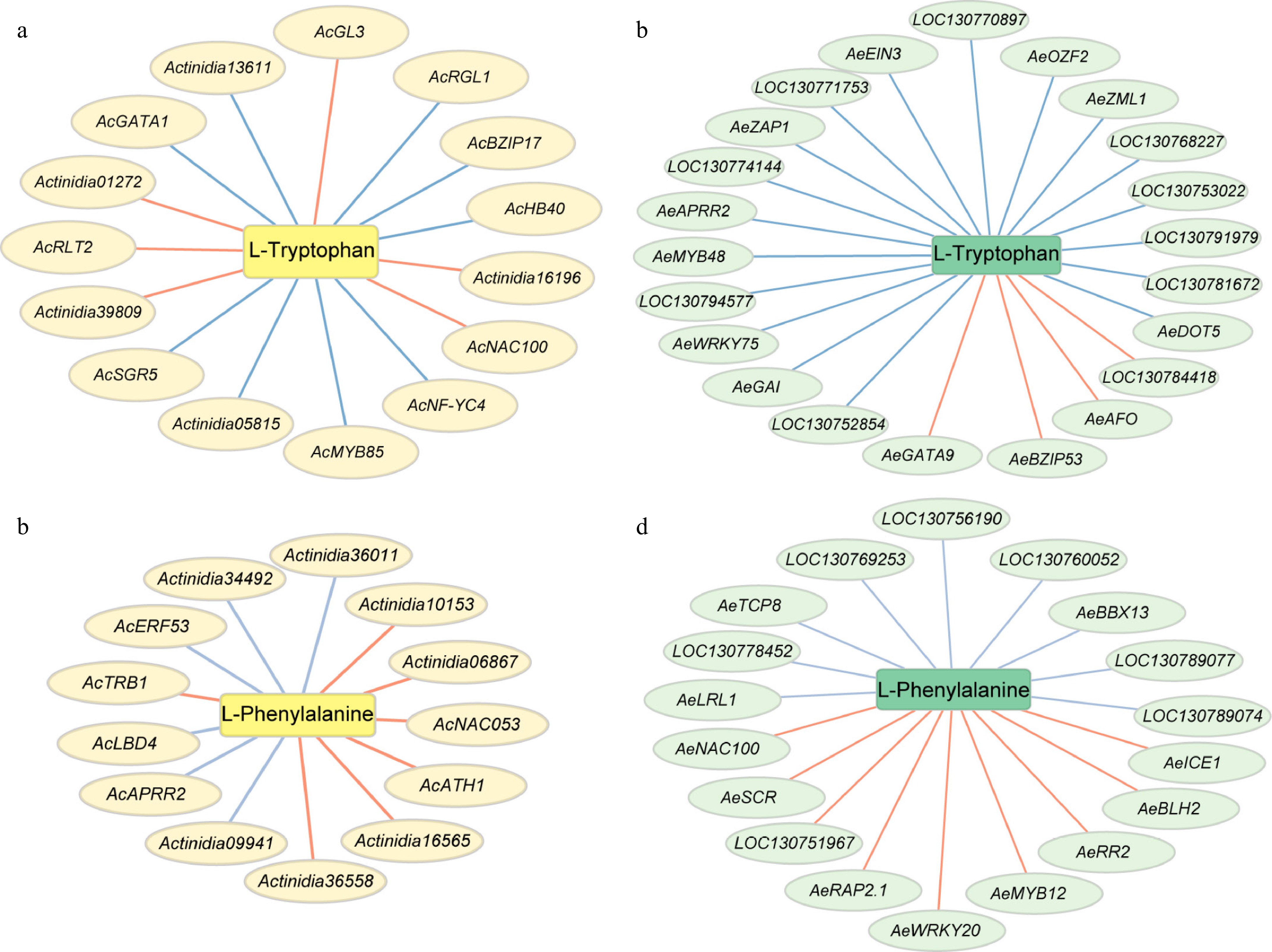 • To gain insights into the AAAs metabolism pathway during fruit ripening, we first screened for potential differentially expressed transcription factors (TF). A total of 506 DEGs encoding TFs were identified, predominantly belonging to the MYB and MYB_related families, bHLH family, ERF family, and C2H2 family (Supplementary Table S5). Next, we calculated the correlation using differential expressed TFs and DAMs, subset with correlation coefficient absolute values of > 0.9 and p-value < 0.05 was generated (Supplementary Table S5). Additionally, correlation networks targeting L-Phenylalanine and L-Tryptophan were visualized. Interestingly, AcNAC100 was positively correlated with L-Tryptophan in A. chinensis (Fig. 5a), while AeNAC100 was positively associated with L-Phenylalanine in A. eriantha (Fig. 5d). Similarly, AcAPRR2 and AeAPRR2, were both negatively correlated with L-Phenylalanine in A. chinensis (Fig. 5b) and L-Tryptophan in A. eriantha (Fig. 5c), respectively.