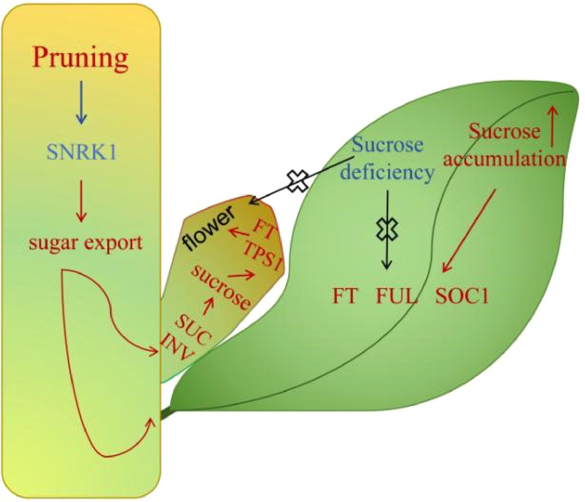 Hypothetical model depicting the flowering regulation promoted by pruning in blueberries. After pruning, the sugar content in the stem decreases, and the expression levels of VcFT, VcFUL, and VcSOC1 increase as the leaf sucrose continues to accumulate to a certain level. The increased expression levels of VcSUC and VcINV promote sucrose accumulation in buds, and the participation of VcFT and VcTPS1 jointly induces flowering. However, if the sucrose content in the cutting leaves is deficient, the expression of the above genes cannot be induced, and the process of flower bud induction cannot begin.