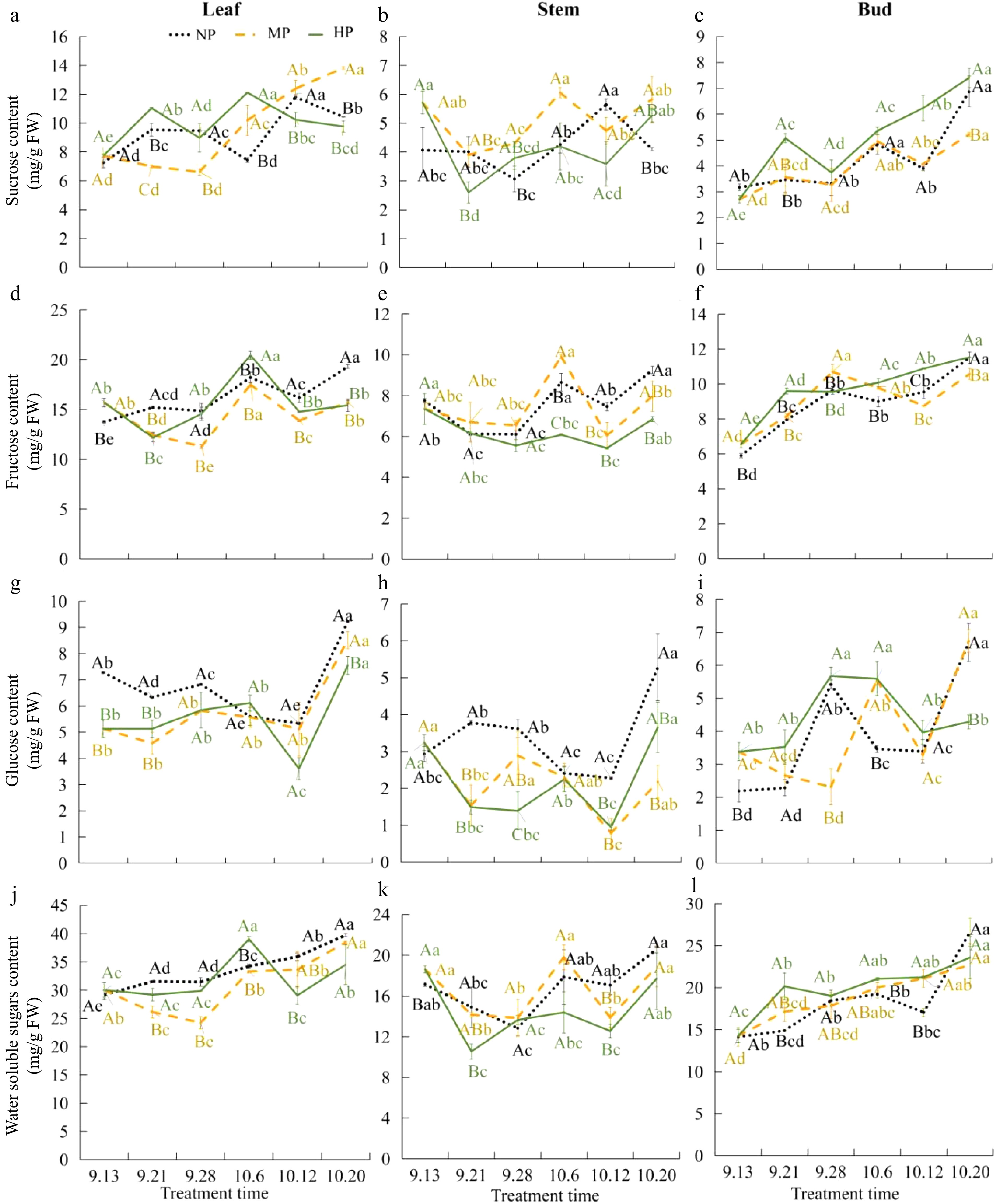 Sugar content in different parts of autumn short 14 pruning. (a)−(c) Sucrose content in leaves, stems, and buds. (d)−(f) Fructose content in leaves, stems, and buds. (g)−(i) Glucose content in leaves, stems, and buds. (j)−(l) Water soluble sugar content in leaves, stems, and buds, respectively. NP indicates the head of the non-pruned shoot, MP indicates the middle of the non-pruned shoot, and HP ndicates the head of the pruned shoot. Duncan's multiple range test was used for significance analysis. Different lowercase letters indicate significant differences at the p < 0.05 level between the same treatment and different treatments, while different uppercase letters indicate significant differences at the p < 0.05 level between different treatments at the same time. The same applies below.
