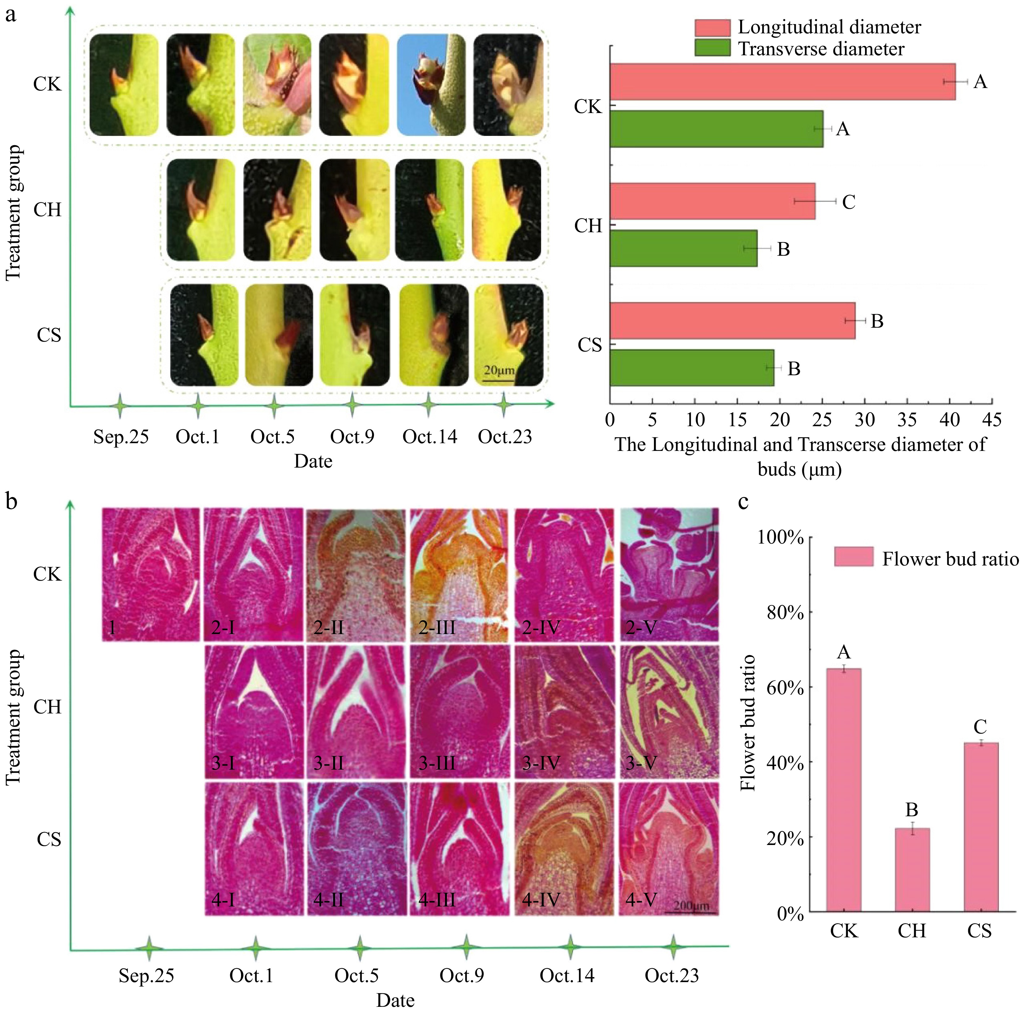 • To determine the effect of the sucrose treatment on flower bud differentiation process of axillary buds, the morphological and anatomical structure of the buds were observed and statistically analyzed. The longitudinal and transverse diameters of axillary buds in the CK (only pruning) group were significantly higher than those in the CH (pruning and cutting half a leaf) and CS (pruning and cutting half a leaf and sucrose treatment) groups. Significant swelling of axillary buds was observed in the CK and CS groups on October 5 and 14, respectively (Fig. 3a).