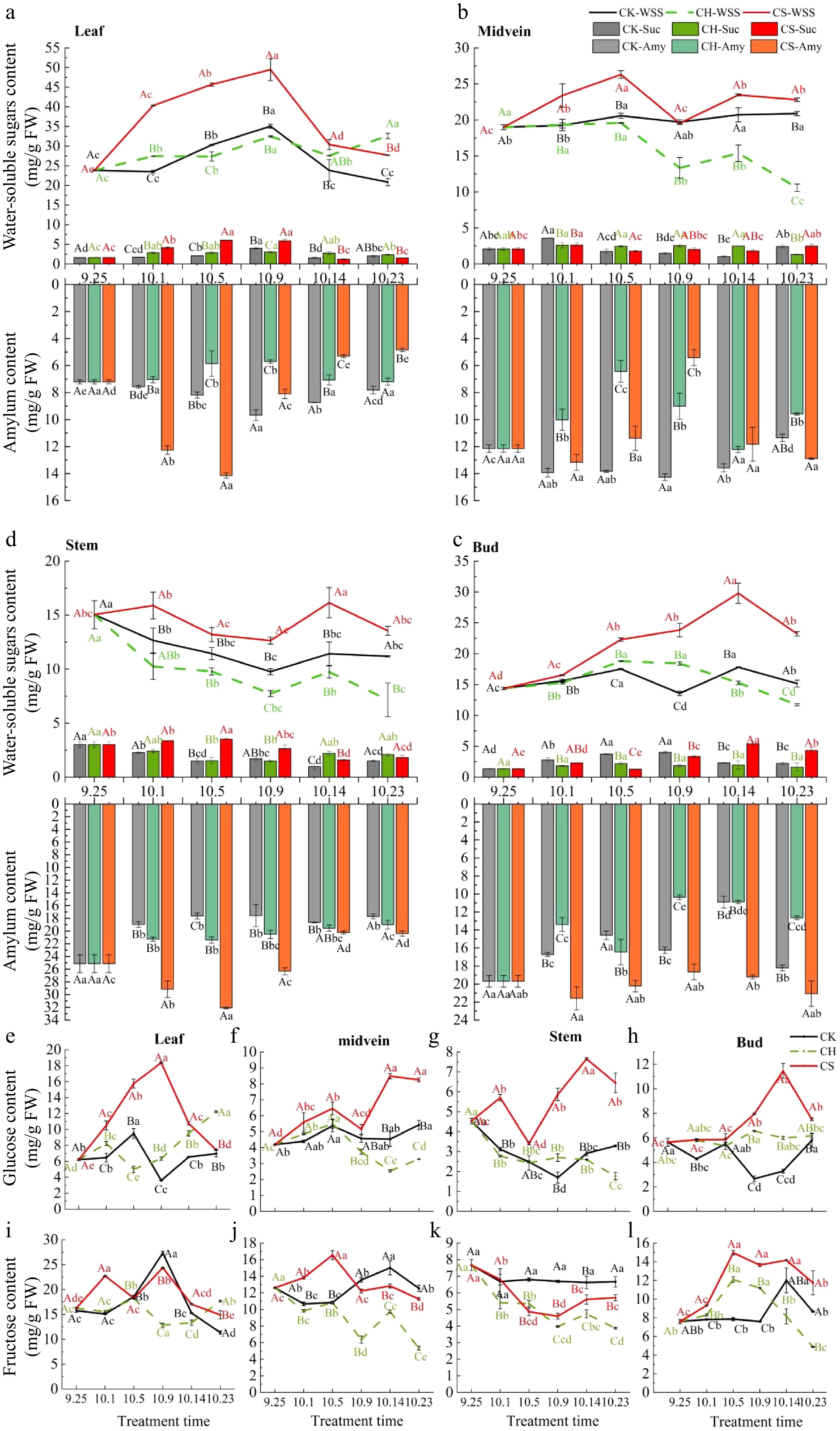 • After treatment, the fructose content in buds of the CH and CS groups rapidly increased and reached the peak on October 5 at 12.09 mg/g FW and 14.96 mg/g FW, respectively. Subsequently, it decreased rapidly in the CH group, while in the CS group it remained at a certain level (Fig. 4l). There was only a brief increase on October 14 in CK group, and it remained at a certain level for the rest of the time (Fig. 4l). Fructose content in leaves of CK and CS groups significantly increased during the floral induction period and then decreased during morphological differentiation period (Fig. 4i), while showing a stable level in leaves and leaf midvein of CH group (Fig. 4i, j). Sucrose spray increased the fructose content of leaves. The fructose content in buds increased and then decreased during the morphological differentiation period. The glucose content in leaves of both CK and CS groups increased during the floral induction period and decreased during the initial morphological differentiation period in buds, with a stable level in the CH group (Fig. 4e & h). The decrease of glucose in leaves and buds of the CK group is always one to two stages earlier than fructose (Fig. 4di). It indicates that the utilization degree or sequence of the two monosaccharides in buds is different during the differentiation stage.