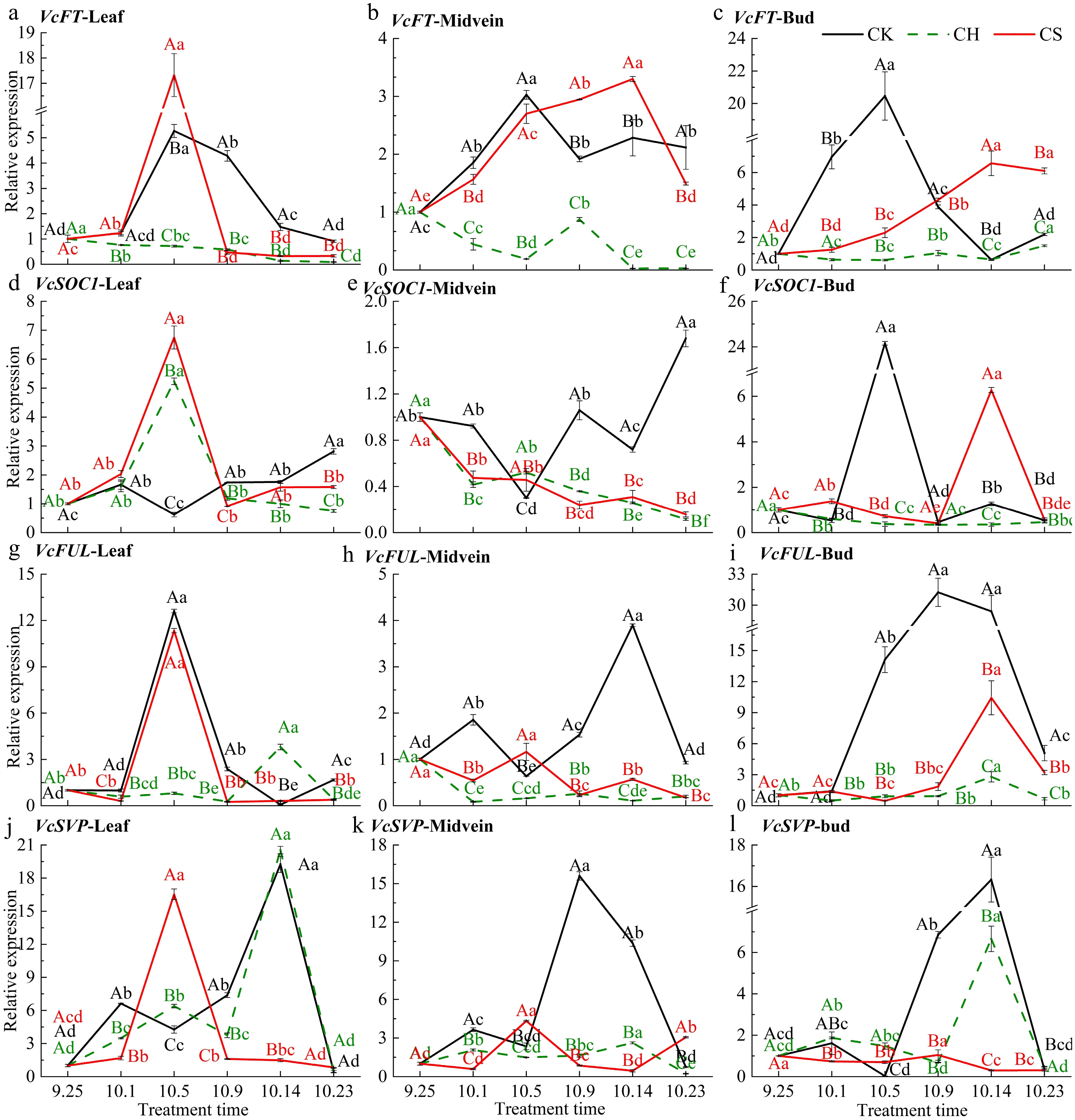 • Flowering-related genes are objective indicators that reflect the process of flower bud differentiation. Sucrose treatment significantly increases the relative expression level of VcFT in various parts and the level of VcFUL and VcSOC1 in buds of the CS group, while in the CH group, there was no significant increase (Fig. 5ac, f & i). The relative expression level of VcFT in both buds and leaf midvein of CK and CS groups increased during the floral induction period, reaching their peak on October 5 and 14, respectively (Fig. 5b, c). VcFUL was mainly expressed in the CK group, whose expression level increases during the floral induction period in buds and morphological differentiation period in buds and leaf midvein (Fig. 5gi). The relative expression level of VcSOC1 in CK and CS group buds increases during the initial differentiation period, while in the leaves and leaf midvein, it mainly plays a role during the morphological differentiation period (Fig. 5df). It indicates that during the floral induction and differentiation period, VcFT in the leaf midvein and VcSOC1, VcFUL, and VcFT in the buds may play a major role. Sucrose treatment reduces the relative expression level of VcSVP in various parts of the CS group on October 1 (Fig. 5jl). The relative expression level of VcSVP in buds, leaves and leaf midvein of the CK group decreases during the floral induction period, then increases during the morphological differentiation period, similar to the expression level of VcFUL(Fig. 5jl).