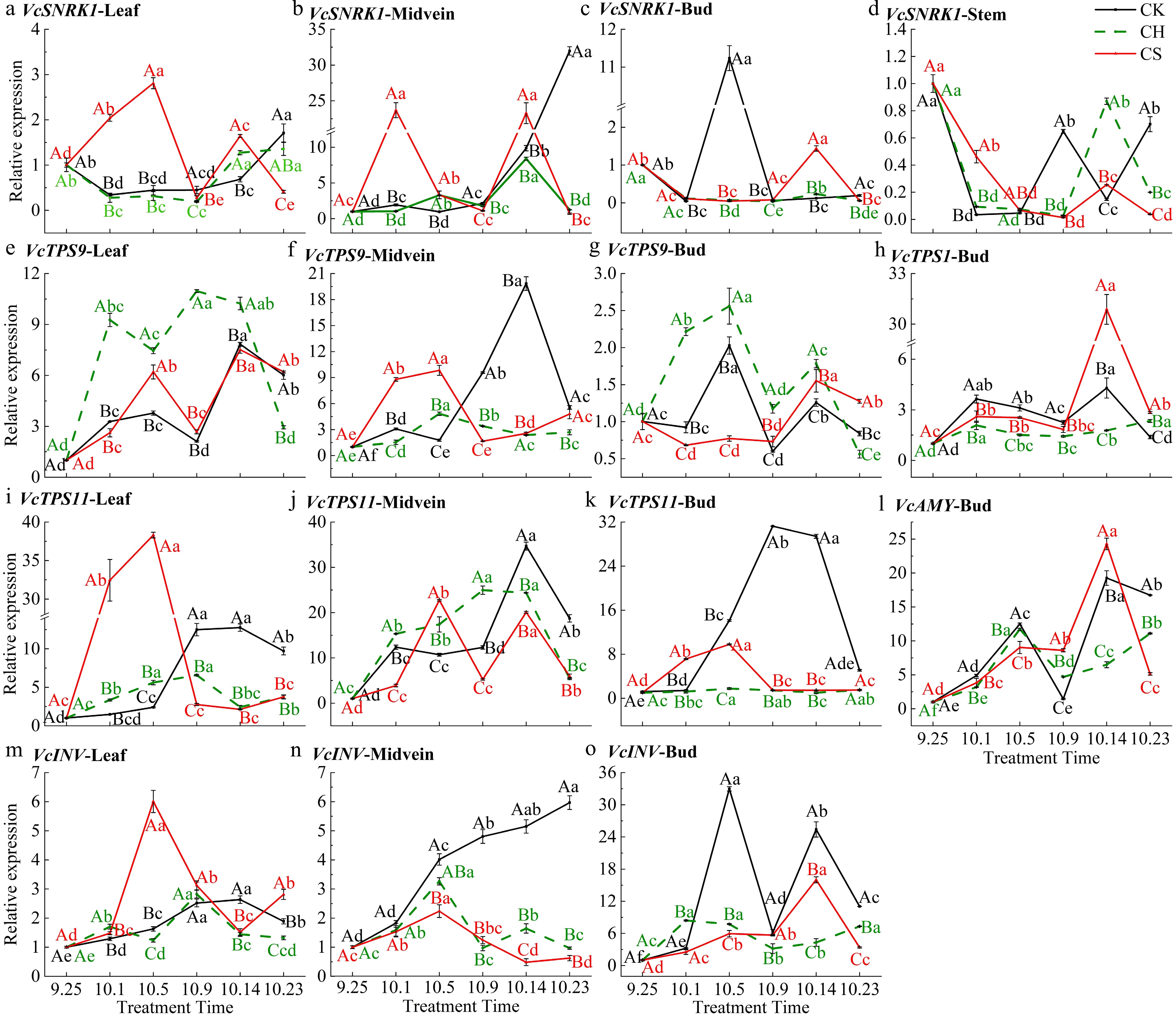 Relative expression level of carbohydrate metabolism-related genes in various parts. (a)−(d) Relative expression level of VcSNRK1 in leaf, midvein, bud, and stem. (e)−(h) Relative expression level of VcTPS9 in lea, midvein, bud, stem, and VcTPS1 in bud. (i)−(l) Relative expression level of VcTPS11 in leaf, midvein, bud, and VcAMY in bud. (m)−(o) Relative expression level of VcINV in leaf, midvein, and bud. CK represents the only pruning group, CH represents the pruning and cutting half a leaf group, and CS represents the pruning and cutting half a leaf and sucrose treatment group.
