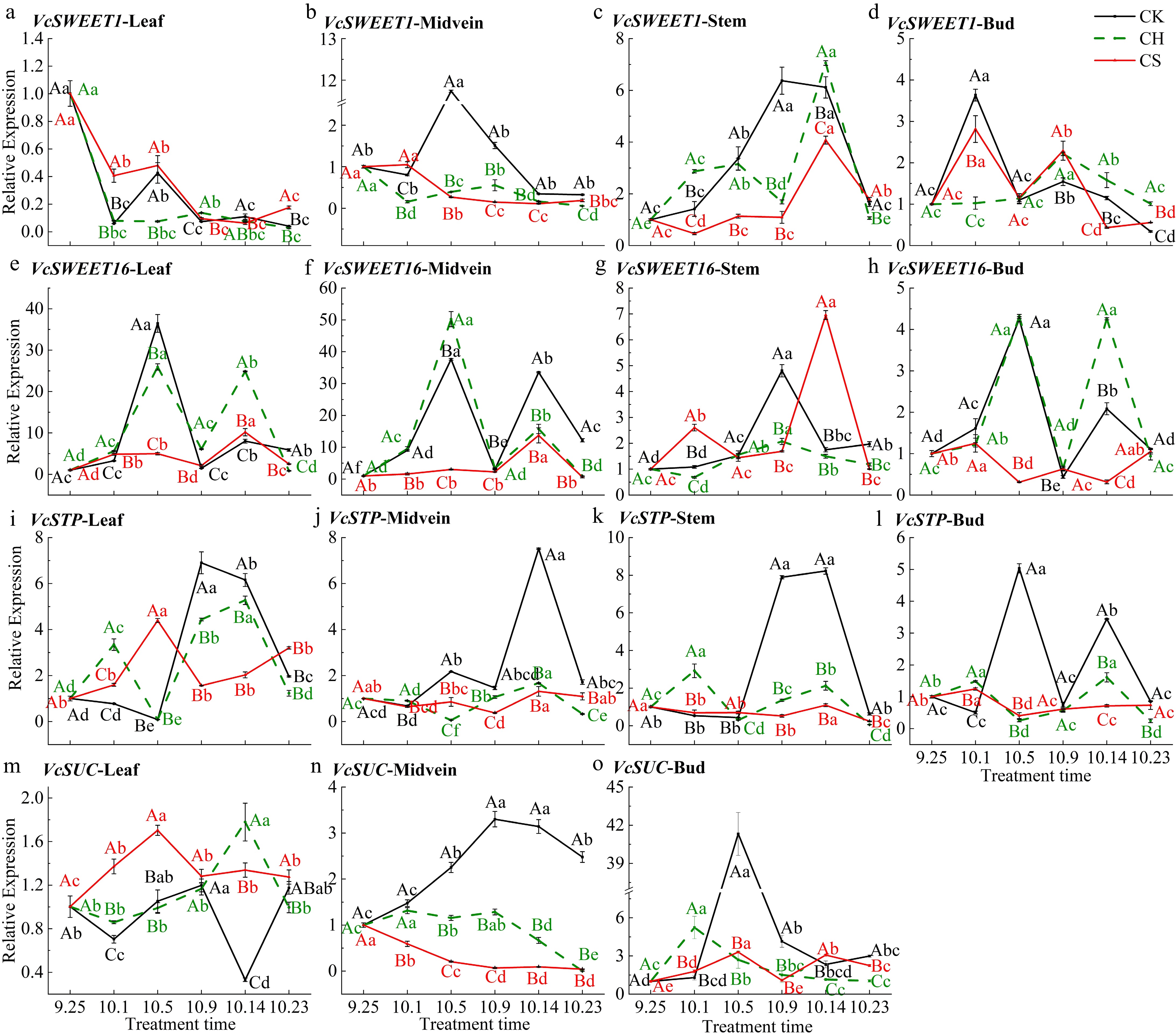 Relative expression level of carbohydrate transport-related genes in various parts. (a), (e), (i) and (m) Relative expression level of VcSWEET1, VcSWEET16, VcSTP, and VcSUC in leaf. (b), (f), (j) and (n) Relative expression level of VcSWEET1, VcSWEET16, VcSTP, and VcSUC in midvein.(c), (g) and (k) Relative expression level of VcSWEET1, VcSWEET16, VcSTP in the stem. (d), (h), (l) and (o) Relative expression level of VcSWEET1, VcSWEET16, VcSTP, and VcSUC in bud, respectively. CK represents the only pruning group, CH represents the pruning and cutting half a leaf group, and CS represents the pruning and cutting half a leaf and sucrose treatment group.