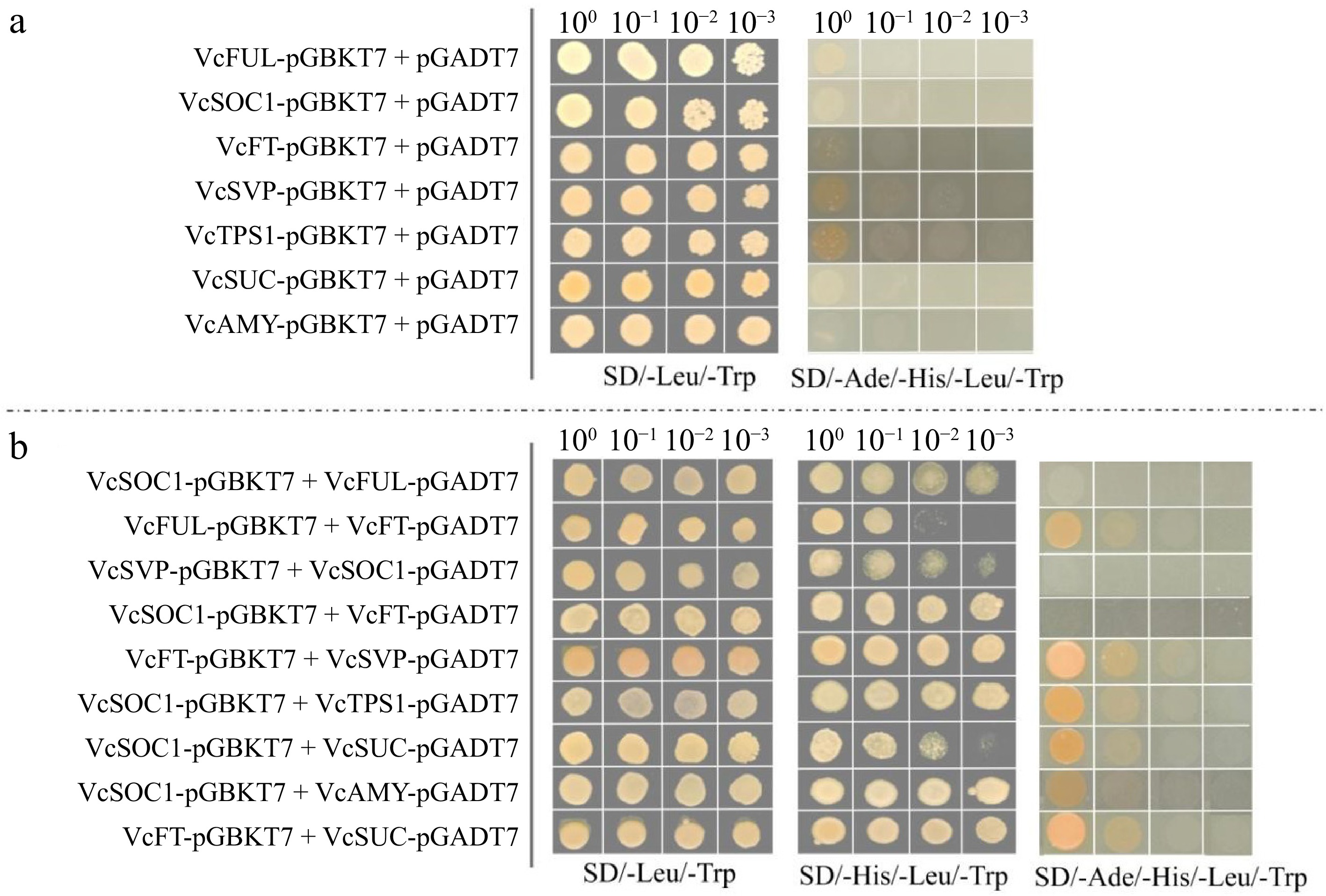 • To confirm whether sugar-related proteins regulate floral through physical interactions with flowering proteins, a yeast two-hybrid experiment was conducted. The yeast strains with VcFUL, VcSOC1, VcFT, VcSVP, VcTPS1, VcSUC, and VcAMY have no transcriptional self-activation activity (Fig. 8a). The flowering proteins VcSOC1-VcFUL, VcFUL-VcFT, VcSVP-VcSOC1, VcSOC1-VcFT, and VcFT-VcSVP yeast strains can grow normally on the SD/-His/-Leu/-Trp medium, but cannot grow on the SD/-Ade/-His/-Leu/-Trp medium. It indicates that there are interactions between them, but they are weak. The verification results of VcSOC1-VcSUC, VcSOC1-VcAMY, VcSOC1-VcTPS1, and VcFT-VcSUC are the same as above, indicating that weak interactions exist (Fig. 8b).