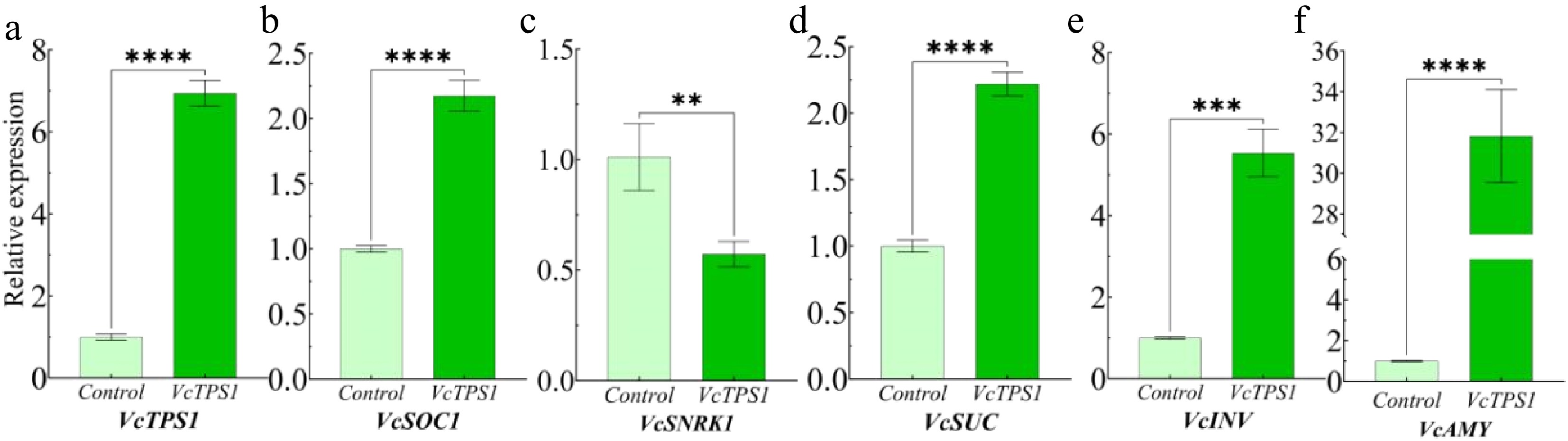Transient conversion expression analysis. (a)−(f) Relative expression level of VcTPS1, VcSOC1, VcSNRK1, VcSUC, VcINV, and VcAMY genes in blueberries transiently transformed with VcTPS1. ** represents very significant difference (p ≤ 0.01), *** represents extremely significant difference (p ≤ 0.001), **** represents extremely significant difference (p ≤ 0.0001).