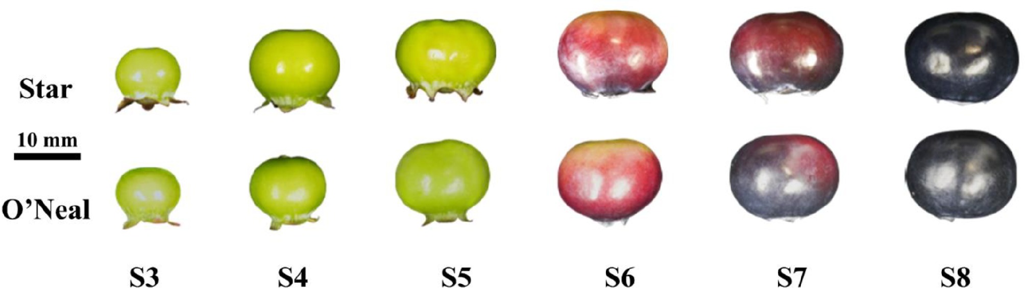 • Blueberry fruits were obtained from the germplasm repository at Zhejiang Normal University. The study focused on two southern highbush blueberry cultivars, 'Star' (firm-flesh) and 'O'Neal' (soft-flesh), which are widely cultivated in the middle and lower reaches of the Yangtze River region. 'O'Neal' serves as the male parent of 'Star', and despite their similar genetic background, the two cultivars exhibit significant differences in fruit firmness. Following the developmental stage classification for blueberries established by Zifkin et al.[25], which is based on fruit size and skin coloration, fruits from both cultivars were harvested at six developmental stages (S3 to S8) for analysis (Fig. 1). Fruit firmness of both 'Star' and 'O'Neal' initially increased, and then decreased (Supplementary Fig. S1). Specifically, fruit firmness peaked at stage S4, reaching 1,061 g·mm−1 for 'Star', and 1,207 g·mm−1 for 'O'Neal'. Fruit firmness declined sharply from stage S4 to S6, with 'O'Neal' showing a more rapid decrease than 'Star'. The fruits were left at room temperature for 1 h to eliminate field heat after harvesting, damaged and diseased fruits were removed. Fruits with similar size and developmental state were chosen for liquid nitrogen treatment and stored at −80 °C for later use. Stems, leaves, flowers, and flower buds from these two blueberry cultivars were also collected, treated using liquid nitrogen and preserved at −80 °C for later use.
