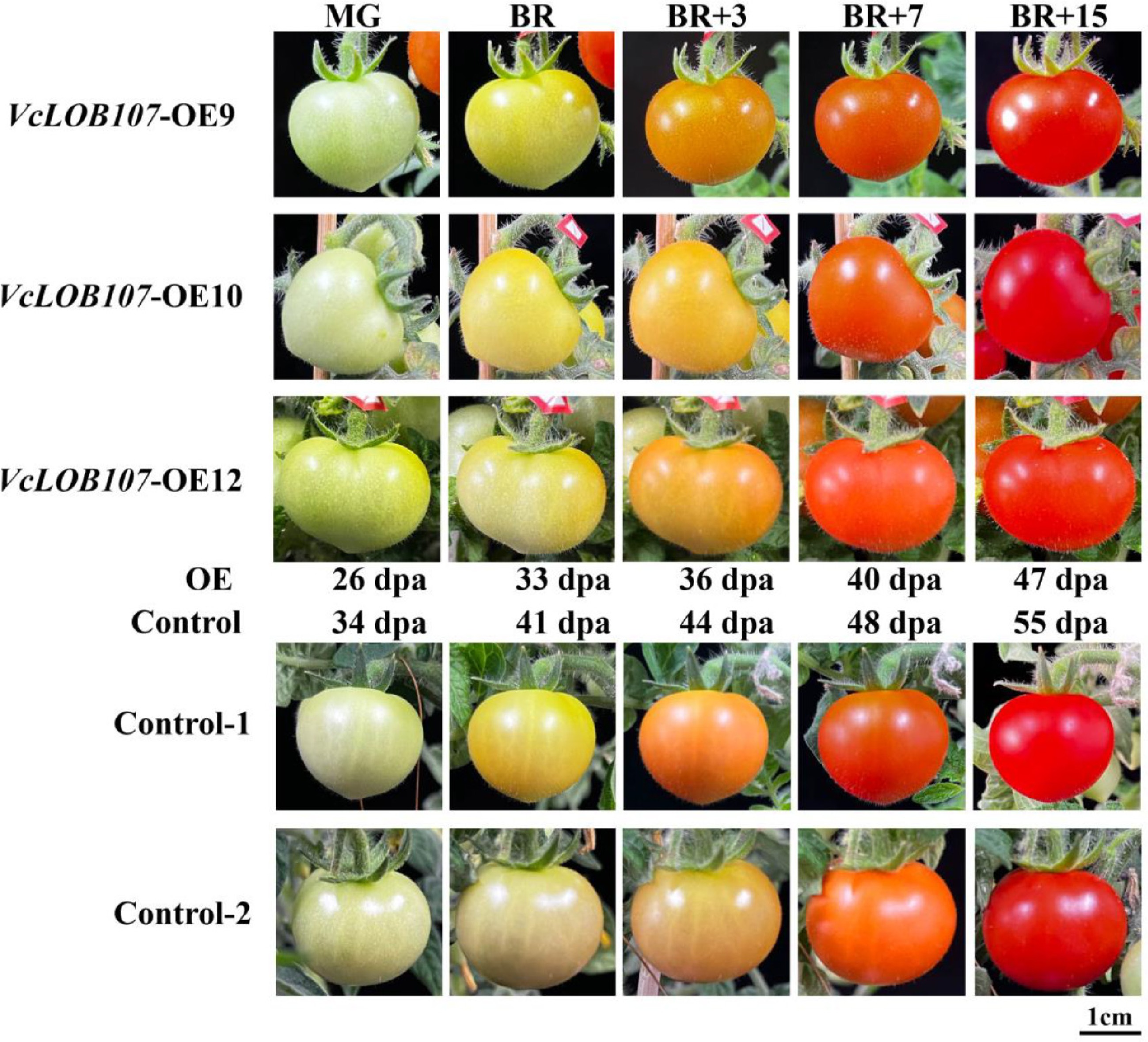 Fruit phenotype alteration of the overexpressed tomato. MG: mature green, BR: breaker stage, BR+3: 3 d after breaker stage, BR+7: 7 d after breaker stage, BR+15: 15 d after breaker stage. dpa: days post-anthesis.