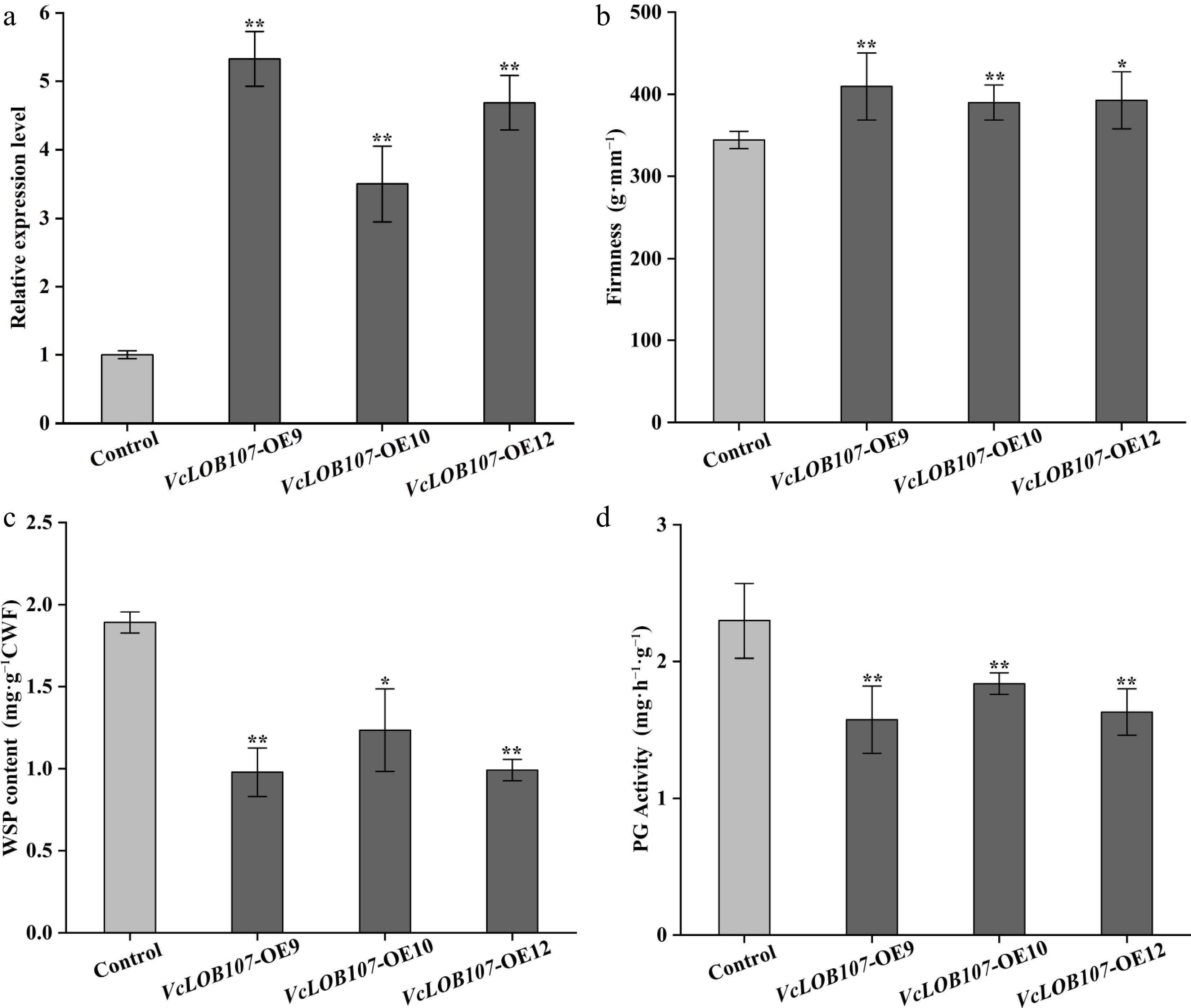VcLOB107 expression, fruit firmness, WSP content, and PG activities in the overexpressed tomato fruits (measured at 15 d after breaker stage). (t-test, * p < 0.05, ** p < 0.01).