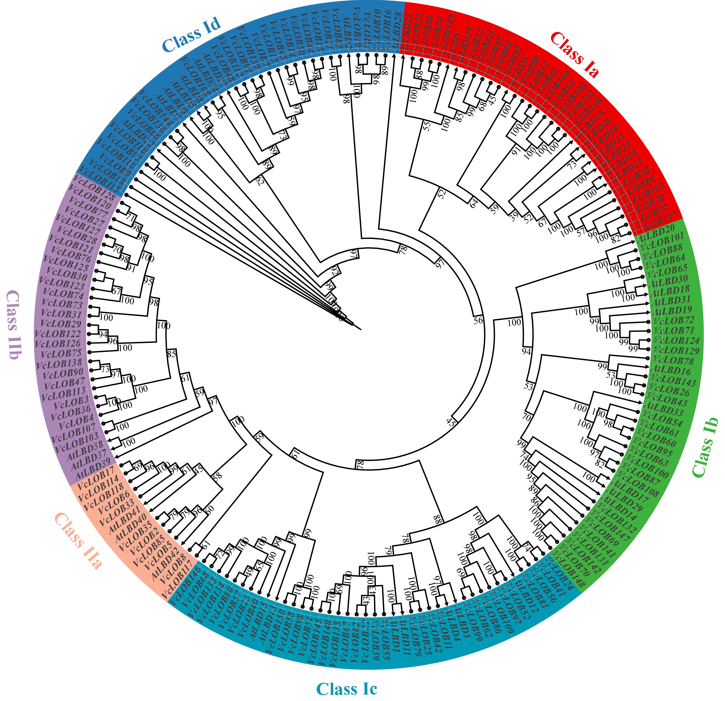 • A total of 150 VcLOB genes were identified in the blueberry genome. They were named from VcLOB1 to VcLOB150 according to their physical localization on the scaffold. A phylogenetic tree was constructed using 43 AtLOB protein sequences, and all VcLOB protein sequences, to investigate the subfamilies within VcLOBs. Based on the identified AtLOBs phylogenetic affiliations, the 150 VcLOB proteins could be divided into Class I and Class II with 112 and 38 VcLOBs within two classes, respectively. Class I was further separated into four subfamilies (Ia, Ib, Ic, and Id) while Class II contained IIa and IIb based on the phylogenetic relationship (Fig. 2). Furthermore, VcLOB numbers within each subfamily were unevenly distributed. The members in Class I subfamilies ranged from 23 to 34, with an average of 28. The subfamilies in Class II showed dramatic differences in member numbers with Class IIa and IIb containing 11 and 27 VcLOBs, respectively.