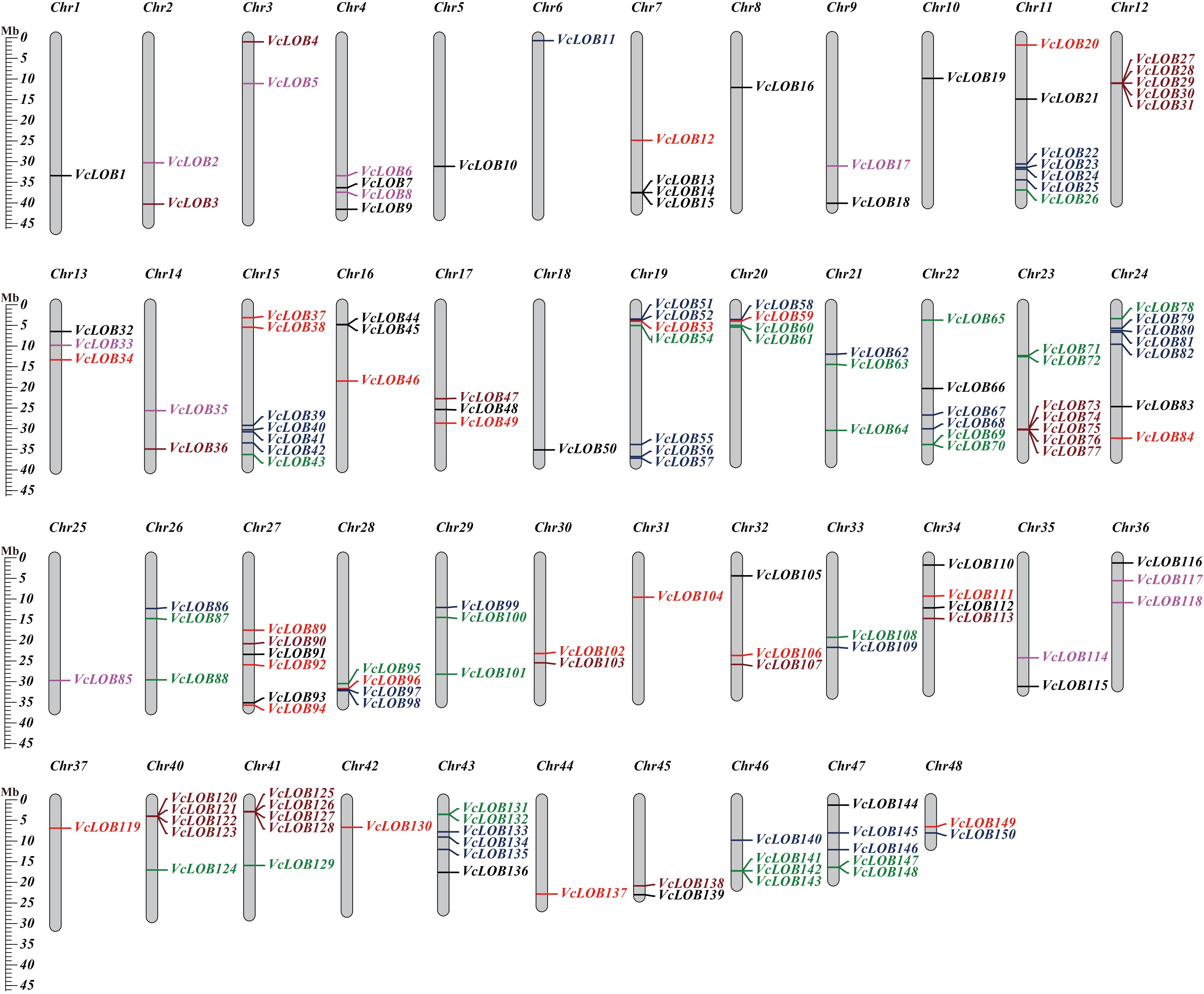 • The 150 VcLOB genes are distributed on nearly all chromosomes except for chromosomes 38 and 39 (Fig. 3). The VcLOB gene numbers of each chromosome ranged from one to seven, with an average number of three. Five chromosomes including chromosomes 11, 15, 19, 23, and 24 showed a higher number of VcLOB distribution than other chromosomes. The VcLOB genes usually exhibited a clustering style on those gene-rich chromosomes. Eleven chromosomes contained only one VcLOB gene. Further analysis of chromosomal localization indicated that Class I members are predominantly found on chromosomes 11, 15, 24, and 43. Class II is mainly found on chromosomes 12, 23, 40, and 41. Thirty two VcLOB genes form 10 gene clusters distributed on 10 chromosomes, with four clusters composed of Class IIb members and four clusters contained Class Ib members, suggesting a clustering distribution trend among gene members of the same subfamily.