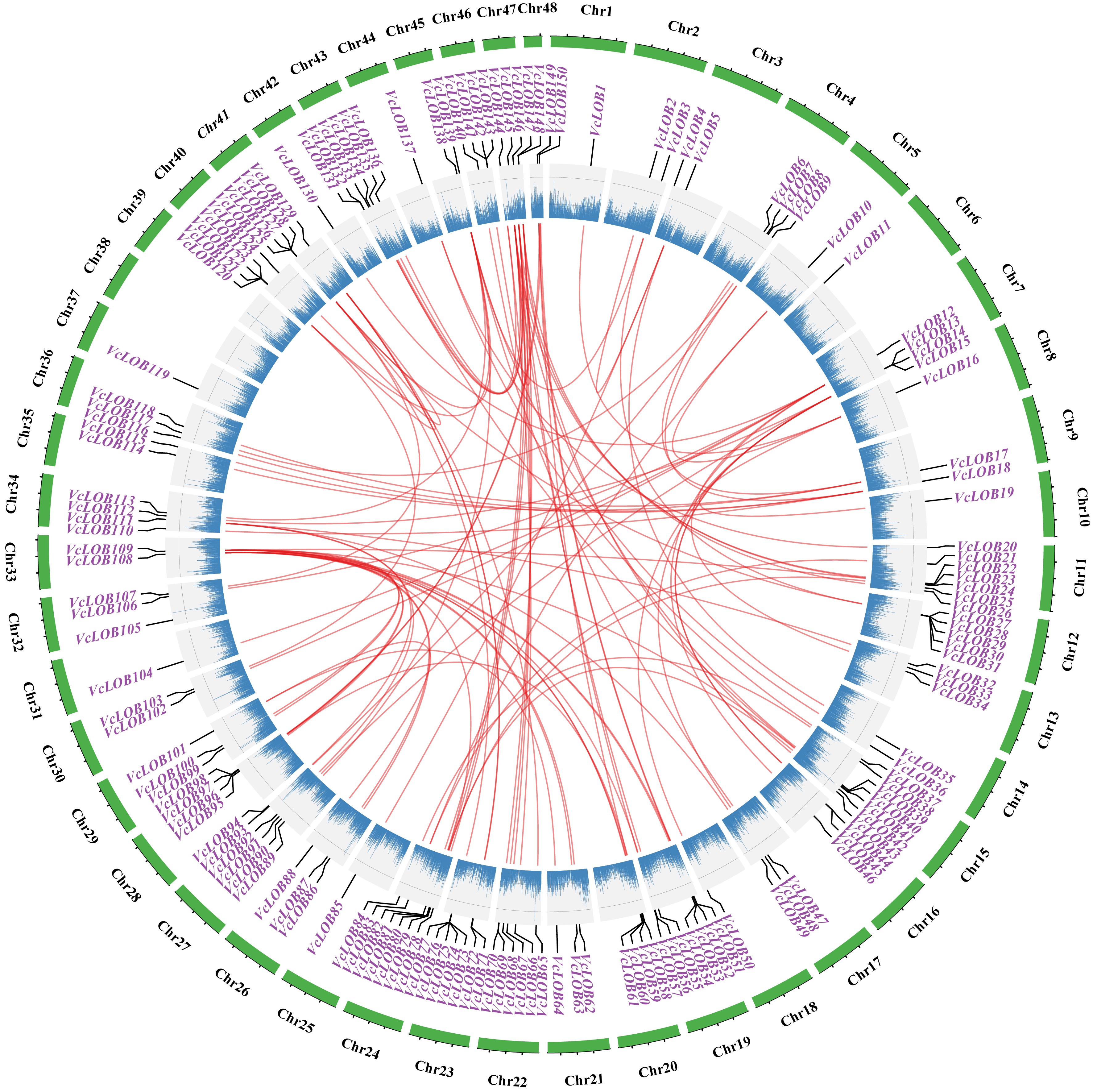 Collinearity analysis of 150 VcLOB genes in blueberry genome. Red represents gene pairs, and blue scatter represents the gene frequency on the chromosome.