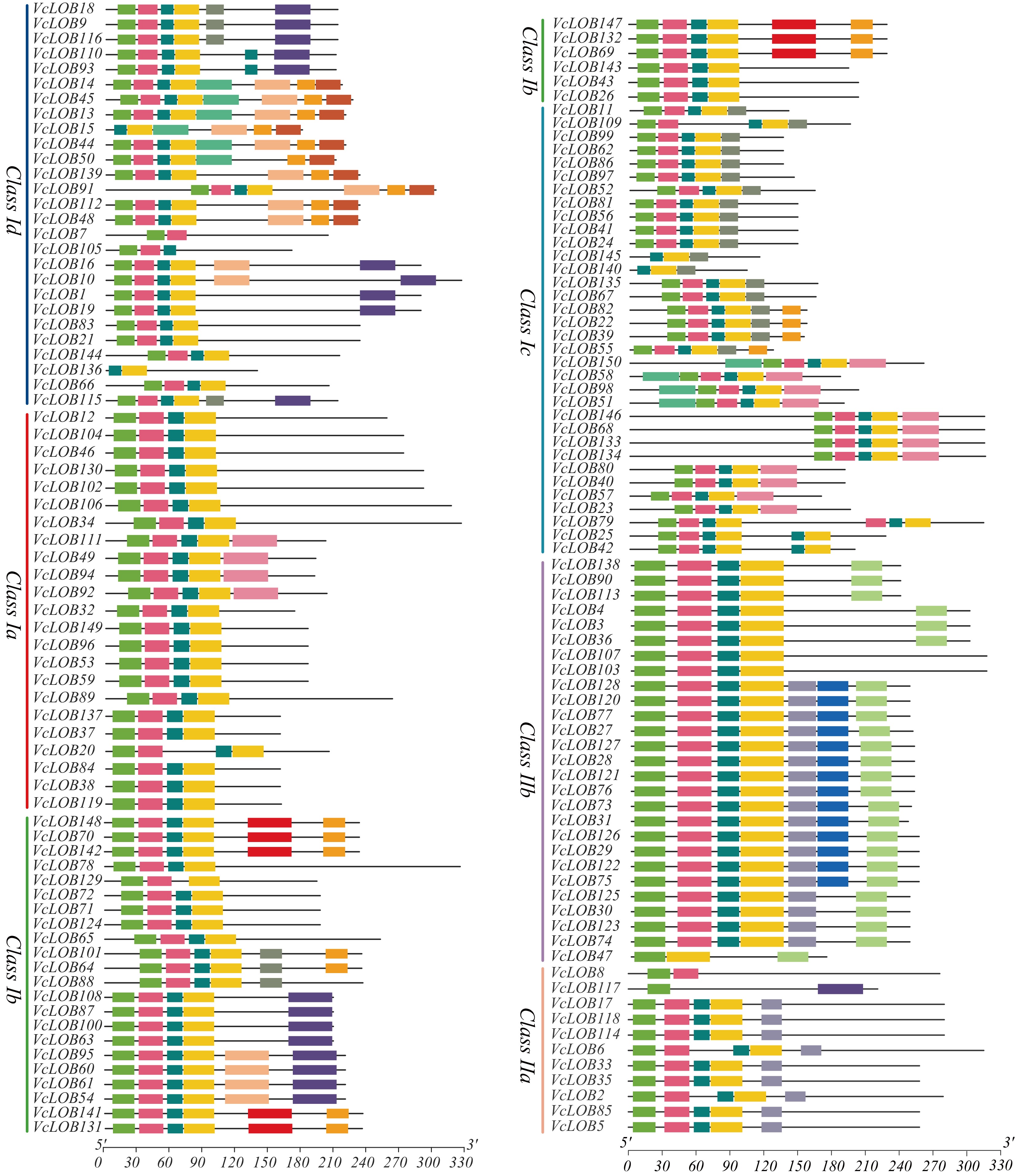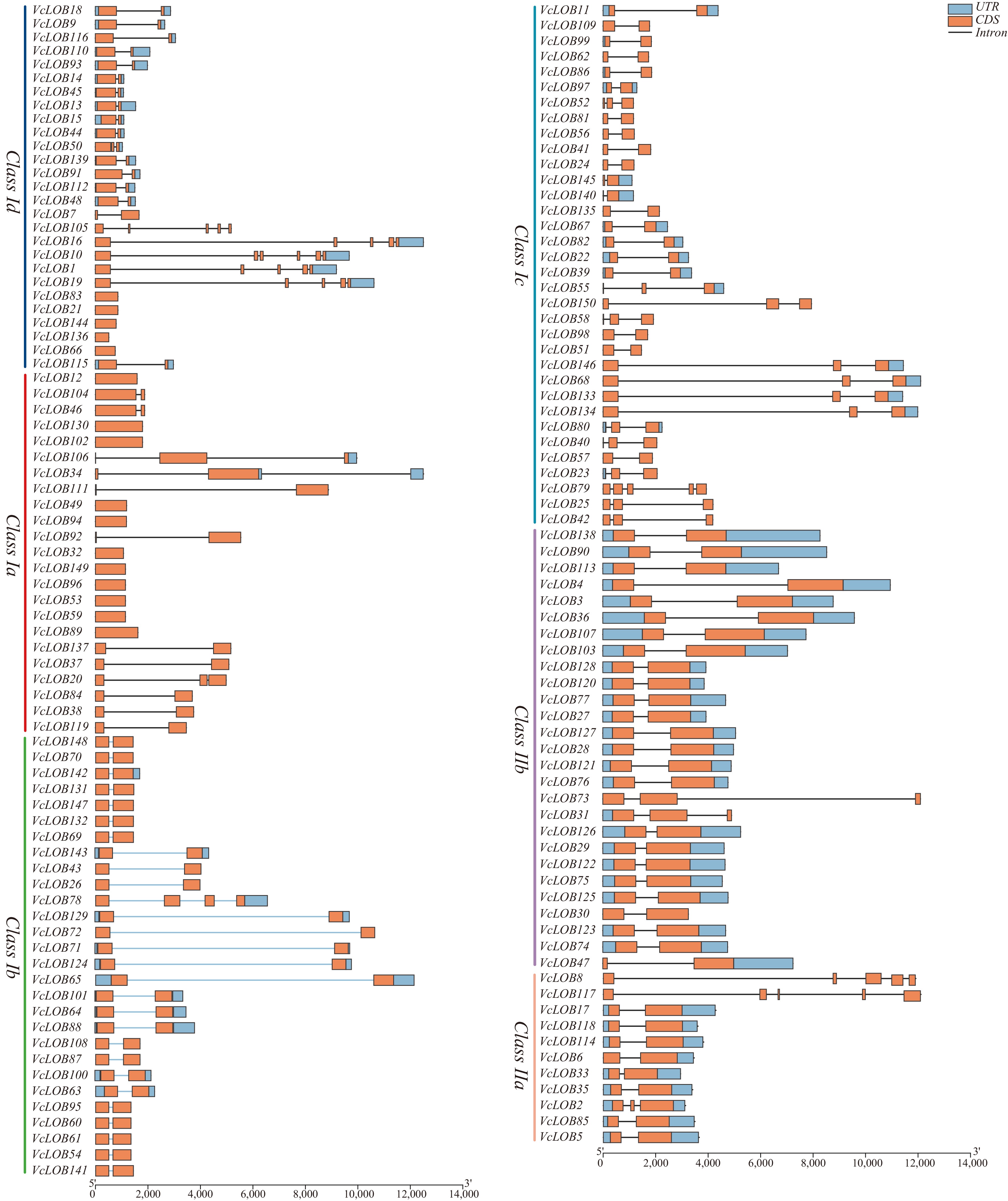 • The lengths of VcLOB genes range from 512 to 12,505 bp, with an average length of 2,316 bp. Significant differences in gene structures between members of Class I and Class II were found (Fig. 5). Class I members have shorter gene lengths than Class II members. Class Ia members have an average gene length of 3,016 bp, among which VcLOB16 (12,505 bp), and VcLOB19 (10,620 bp) are significantly longer than other genes. Except for VcLOB1, VcLOB10, VcLOB16, VcLOB19, and VcLOB105, the remaining genes have one or two exons. Class Ia members had exon numbers ranging from one to three, and an average gene length of 1,699 bp. VcLOB34 (5,989 bp) and VcLOB106 (4,773 bp) were significantly longer than other genes in Class Ia. Only VcLOB34 and VcLOB106 possess untranslated regions (UTR) structures. The average gene length of Class Ib members was 2,098 bp, among which VcLOB65 (6,727 bp) is the largest, and exon numbers ranged from two to four. Class Ic members have two or three exons, with an average gene length of 3,079 bp. Compared to Class I, Class II members are more conservative in their gene structure. The average gene length of Class IIb members is 1,385 bp, with VcLOB73 (2,751 bp) being the longest. VcLOB73 and VcLOB31 have three exons each, while the rest have two exons. Apart from VcLOB73 and VcLOB30, the rest genes possess untranslated regions (UTR). The exon number of Class IIa members ranged from two to five, with an average gene length of 2,368 bp. VcLOB117 (5,647 bp) and VcLOB8 (5,556 bp) gene length were significantly longer than other members and neither gene has UTR structures.