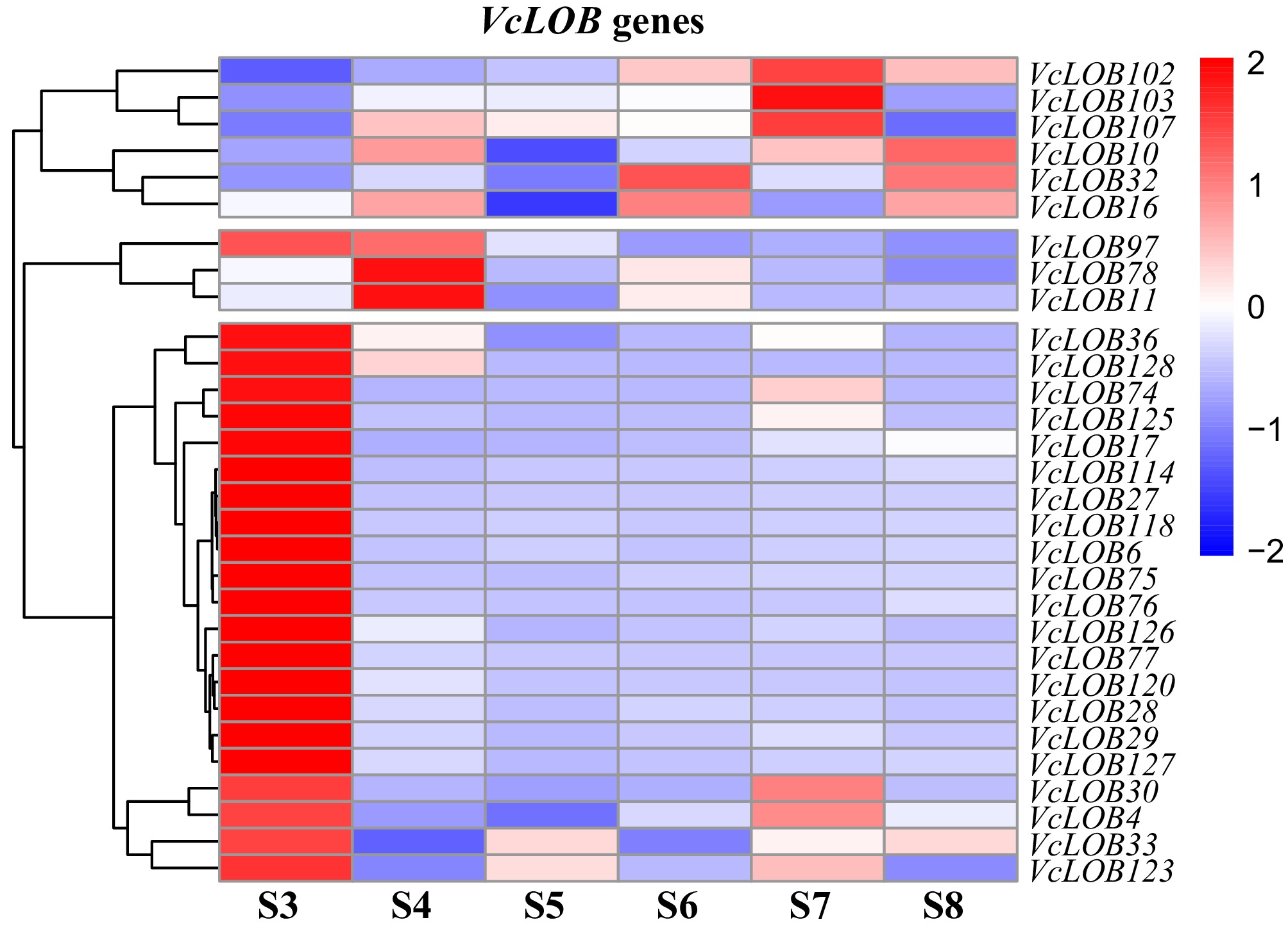 • We randomly selected 30 genes based on the TPM values (Supplementary Table S6) of 'O' Neal' and 'Star' from S3 to S8, and calculated the fold change in TPM values between the two blueberry cultivars at the same developmental stage by calculating the 'O'Neal' to 'Star' TPM ratios. A ratio heatmap was created to illustrate their transcript abundance differences (Fig. 7). If the genes showed more transcript abundance in 'O'Neal' than that in 'Star', the values in the heatmap were indicated with ≥ 0, conversely presented with < 0. The transcript abundance of 22 genes was significantly higher in O'Neal' than those in 'Star' during the S3 stage. In 'O'Neal', VcLOB78 and VcLOB11 showed significantly higher expression levels than 'Star' at stage S4, whereas VcLOB103, VcLOB102, and VcLOB107 had significantly higher expression at stage S7. VcLOB32 and VcLOB16 had notably higher expression in 'O'Neal' compared to 'Star' at stage S6, and VcLOB10 in 'O'Neal' exhibited significantly greater expression than 'Star' at stage S8. The expression levels of these 30 genes at the S5 stage were higher in 'Star' than that in 'O'Neal'.