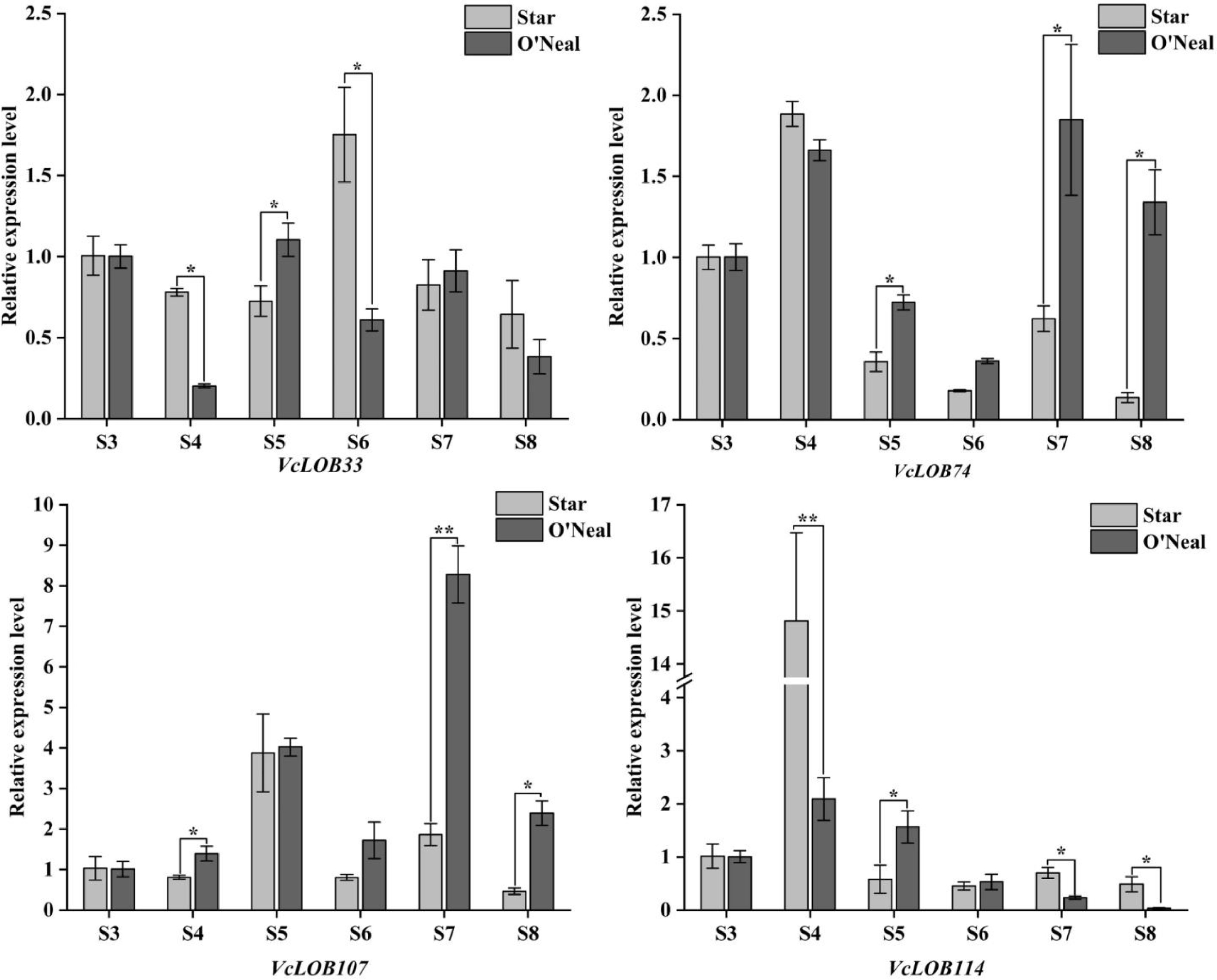 We found four genes that showed significant differences in TPM values between stages and cultivars. They were further analyzed using quantitative PCR. The qPCR results revealed that the relative expression level of VcLOB33 in both blueberry cultivars displayed a trend of initially increasing and then decreasing during fruit development (Fig. 8). The expression level peaked at the S6 stage in 'Star' while it reached a maximum value at S5 stage in 'O'Neal'. Significant differences in VcLOB33 expression levels were observed at stages S4, S5, and S6 between 'Star' and 'O'Neal'. The expression values of VcLOB33 in 'Star' at stages S4 and S6 were 3.00 times compared to that in 'O'Neal'. VcLOB74 showed a higher expression level in 'O'Neal' than that in 'Star' after stage S5, especially at stages S7 and S8. The expression values of VcLOB74 in 'O'Neal' at stages S4 and S6 was 0.98 times compared to that in 'Star'. VcLOB107 reached its maximum expression level of 8.28 at stage S7 in 'O'Neal', which was 4.45 times compared to that in 'Star'. The peak expression value of VcLOB107 in 'Star' was found at stage S5, which did not show significant differences with that in 'O'Neal'. Low expression levels were found for the VcLOB114 gene at stages in both cultivars except for stage S4. Dramatically different expression levels were observed at stage S4 between 'O'Neal' and 'Star'. The expression levels were 2.09 and 14.8 in 'O'Neal' and 'Star', respectively. Although significant differences in expression level were also detected at stages S5, S7, and S8, the VcLOB114 gene showed lower expression values than other VcLOB genes.