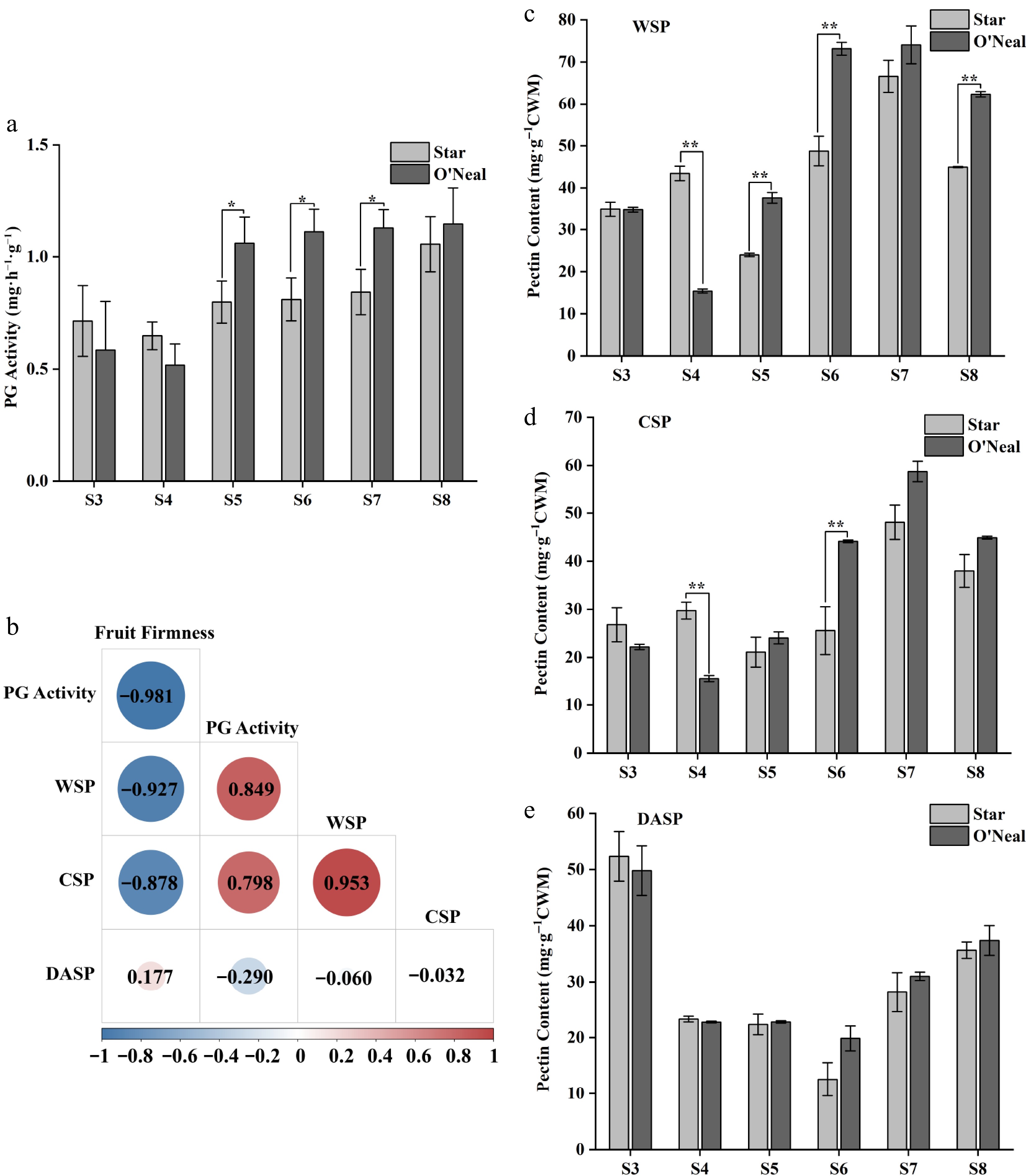 PG activity, correlation between fruit firmness and physiological indicators, and pectin contents at different developmental stages of 'Star' and 'O'Neal' fruits. (t-test, * p < 0.05, ** p < 0.01).