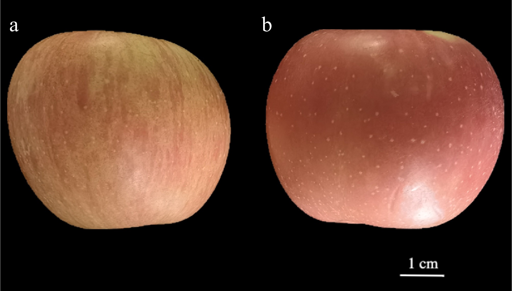 • Visual inspection revealed pronounced phenotypic differences between the mutant and cultivar-type apples (Fig. 1). The mutant exhibited a thin-skinned peel with a distinct yellowish-red base coloration, overlaid with irregular red striations. Additionally, the surface displayed a high density of small, yellow lenticels (Fig. 1a). In contrast, the cultivar-type apple had a thicker peel with a more uniform reddish color and only faint yellow undertones. While lenticels were present, their distribution was limited, resulting in a smoother and more visually uniform peel surface compared to the mutant (Fig. 1b).