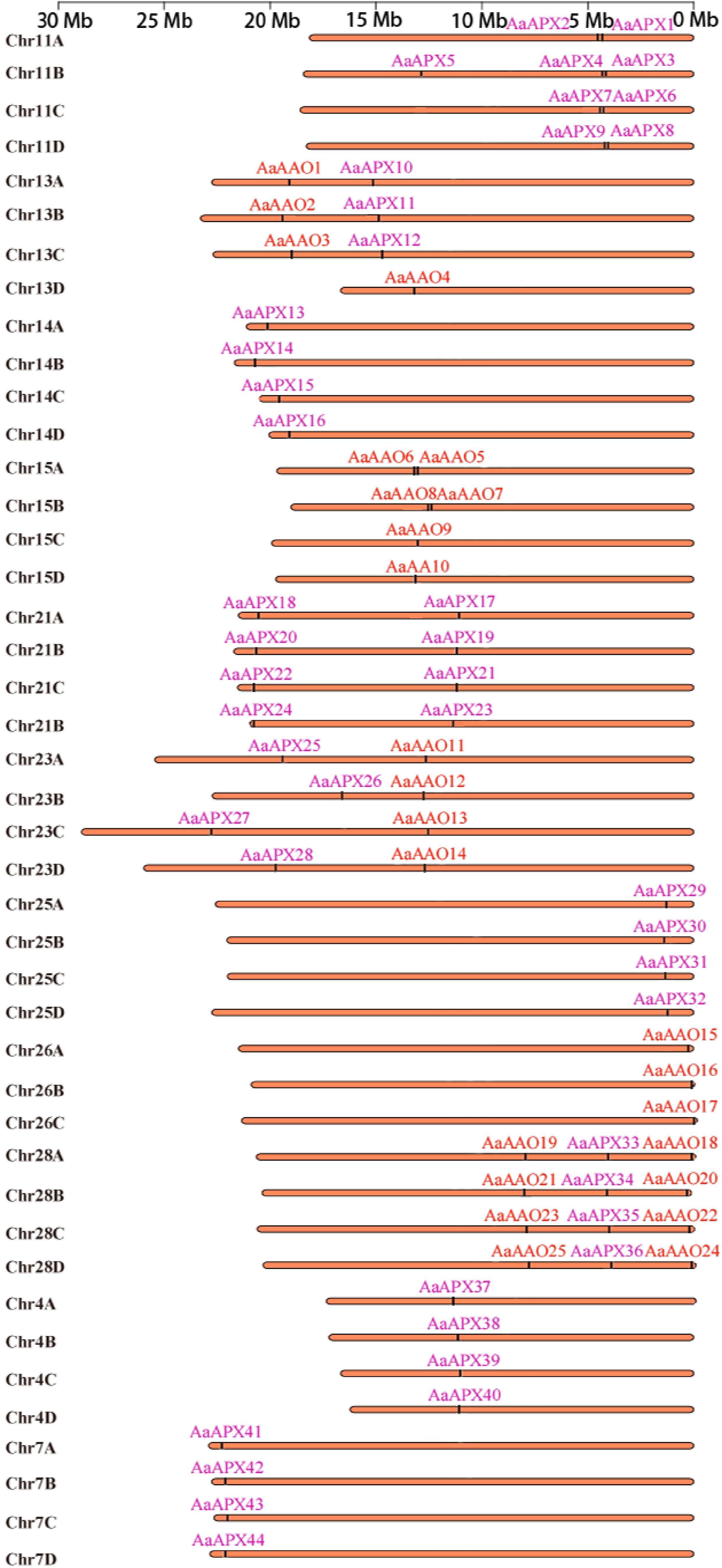 • In the present study, bioinformatics tools were employed to perform a genome-wide analysis of AAO and APX genes present in five Actinidia species and A. thaliana, as shown in Supplementary Table S3. A total of 14 to 44 AAOs and six to 25 APXs were identified in Actinidia plants, respectively (Supplementary Table S3). In the A. arguta 'M' genome, 25 AaAAOs (AaAAO1-AaAAO25) and 44 AaAPXs (AaAPX1-AaAPX44) genes were identified based on their order in chromosomes of the A and D sub-genomes, and dispersed across five and nine distinct chromosomes, respectively. Notably, the majority of these chromosomes contained only a single AaAAO or AaAPX gene. In contrast, two to three AaAPX genes were concurrently localized on chromosomes 21A-D and 11A-D, whereas two AaAAO genes were found on chromosomes 28A-D and 15A-B. Moreover, specific subsets of AaAAO (e.g., AaAAO1114) and AaAPX (e.g., AaAPX2528) genes exhibited co-localization on chromosomes 13, 23, and 28 within the A and D sub-genomes (Fig. 1).