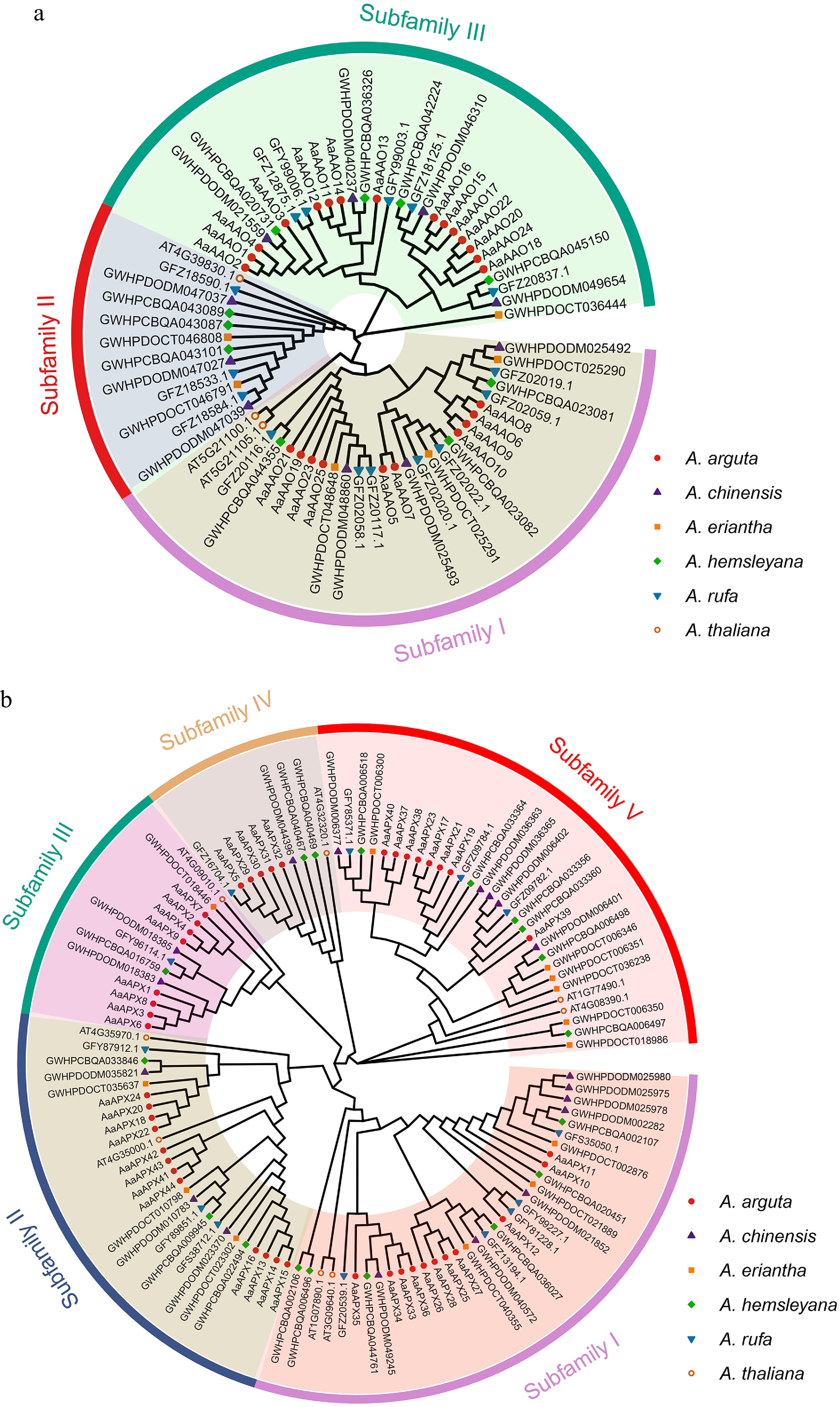 Phylogenetic analyses of the (a) AAO, and (b) APX families from five Actinidia species and Arabidopsis. Colored outer rings represent diverse subfamilies.