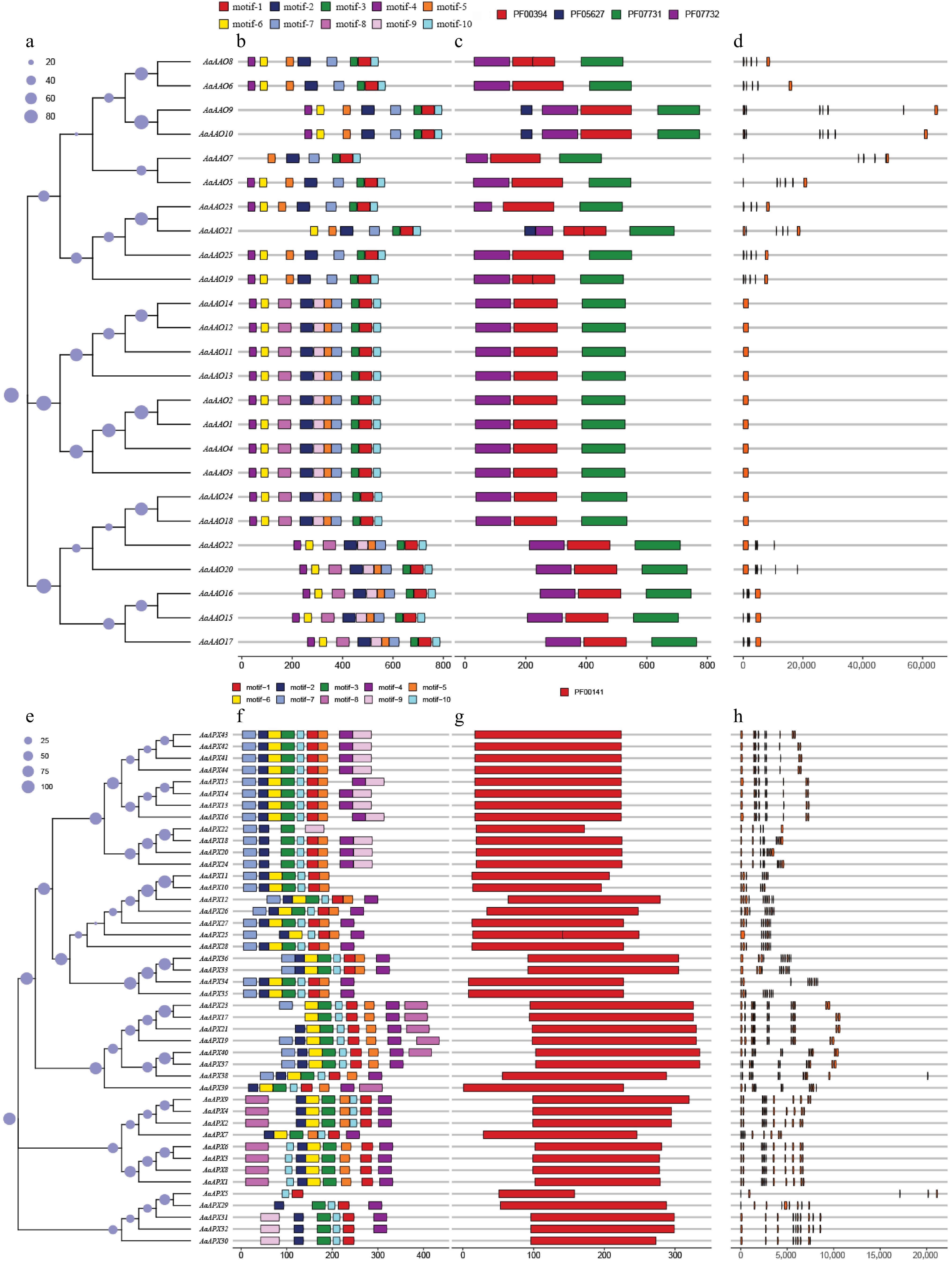 (a)–(d) shows the analysis of AaAAOs genes, and (e)–(h) shows the analysis of AaAPXs genes. (a), (e) Neighbor-joining trees constructed for AaAAOs and AaAPXs genes, respectively. (b), (f) Protein motifs, with motifs 1–10 displayed in different colored boxes. (c), (g) Conserved domains, represented by different colored boxes. (d), (h) Gene structures, where orange boxes represent CDS.