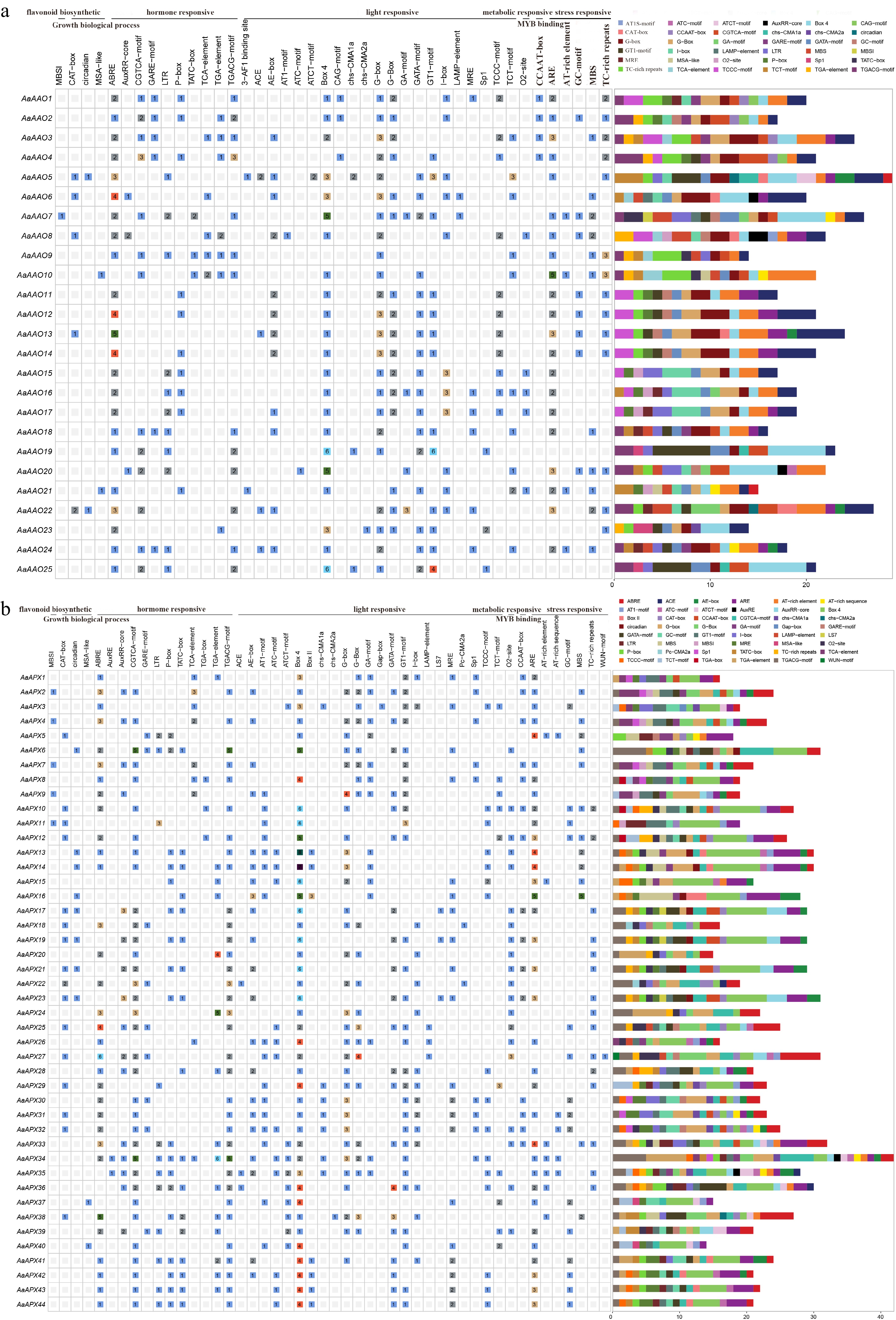 Predicted cis-elements within the 2,000 bp upstream region of AaAAO and AaAPX genes. Different colors indicate distinct cis-element categories, with numbers displayed in the corresponding boxes. (a) AAO gene family. (b) APX gene family.