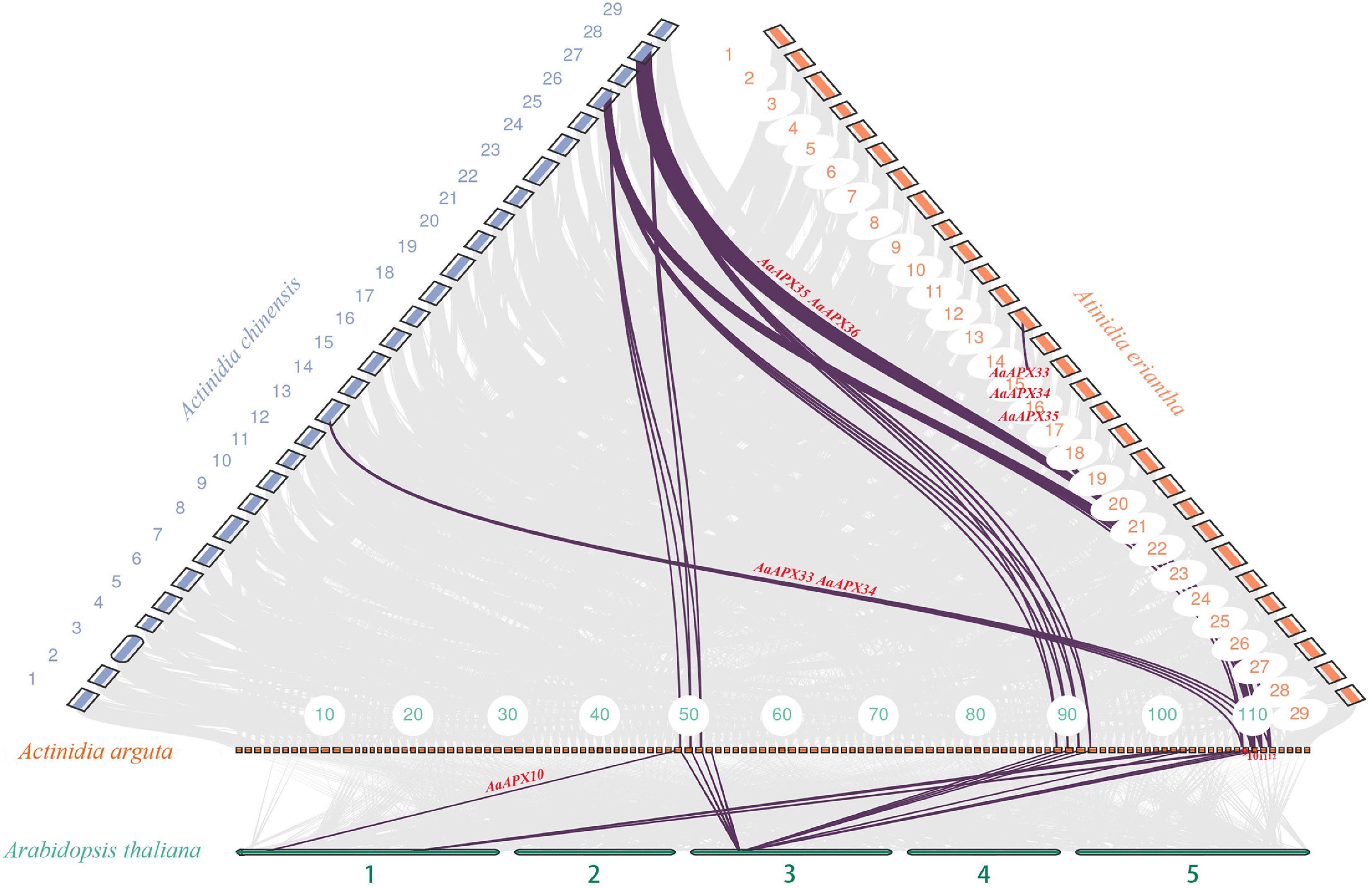 Collinearity analysis of the APX gene family between A. arguta and three related species (A. thaliana, A. chinensis, and A. eriantha). Gray lines indicate overall collinear regions, while colored lines denote orthologous gene pairs.