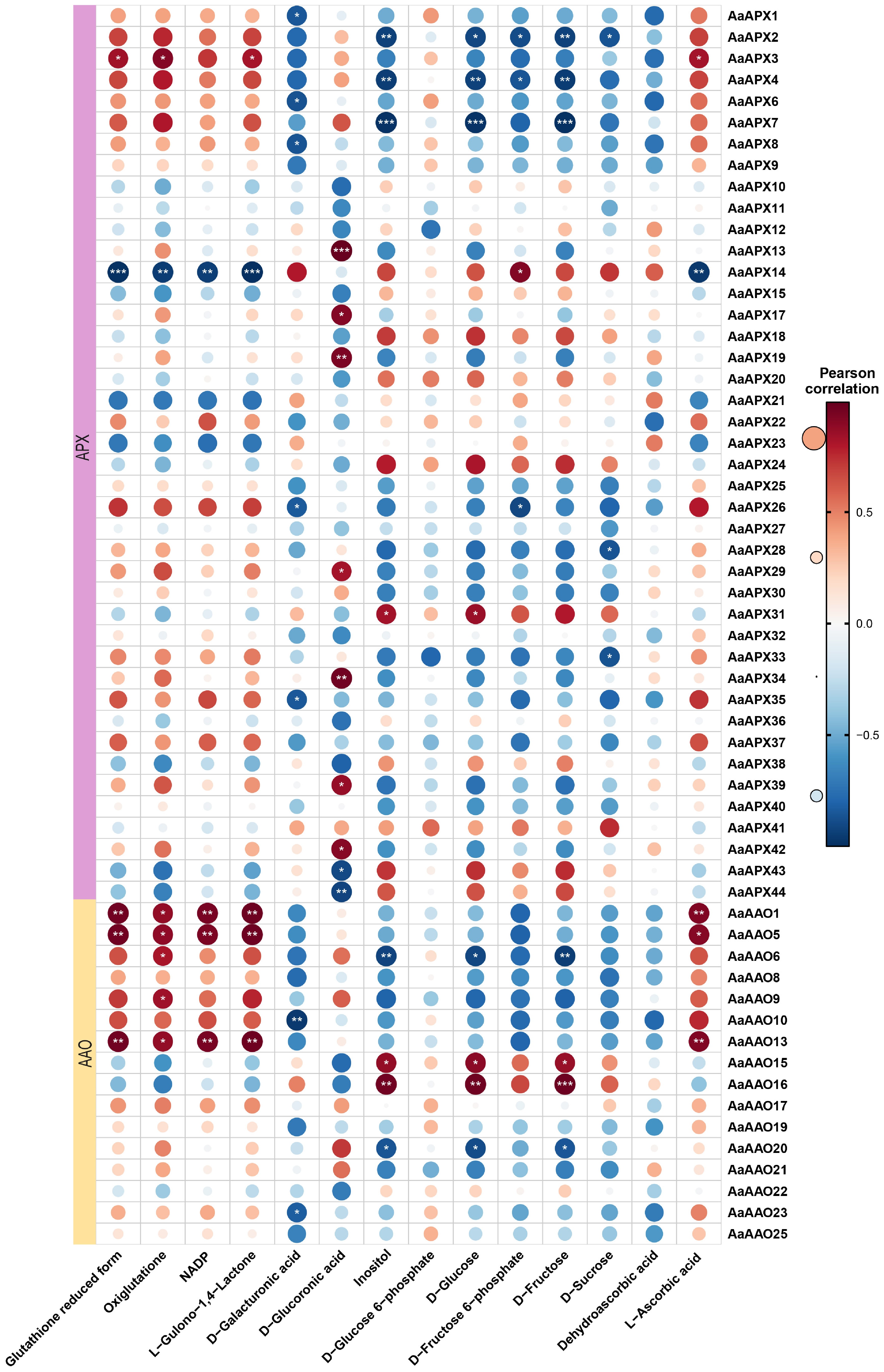 Correlation analysis between the expression of AaAAO and AaAPX genes and ascorbic acid-related metabolites in A. arguta. Red and blue color notes positive and negative correlations with gene expression, respectively.