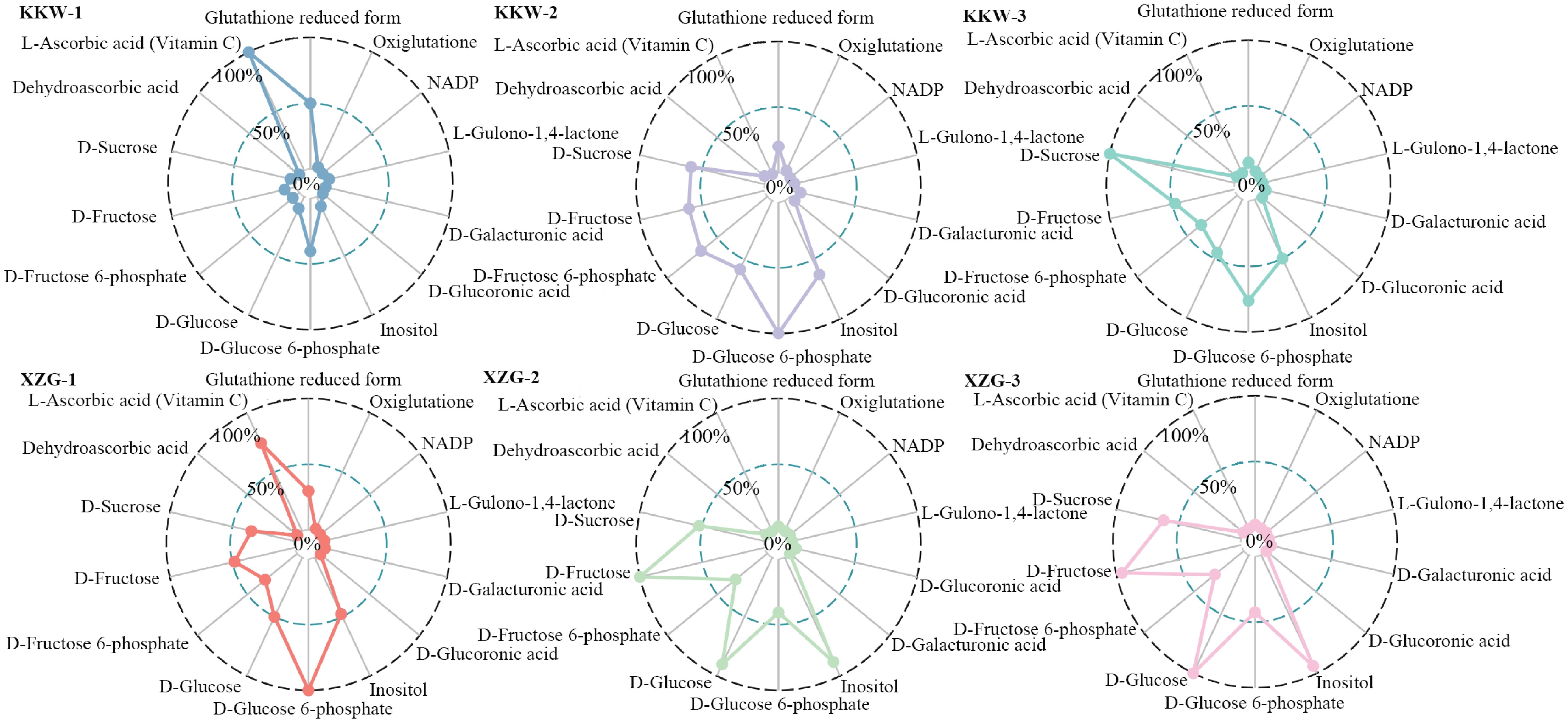 Notably, it was observed that L-ascorbate displayed the highest accumulation at the developmental stage in KKW and then gradually declined during subsequent kiwifruit ripening, with a higher content than the other varieties at the T1 stage (Fig. 9). In contrast, XZG samples exhibited higher levels of fructose and glucose compared to KKW. Correlation analysis showed that AaAAO15 and AaAAO16 were positively correlated with fructose content, whereas AaAAO6, AaAAO20, AaAPX2, AaAPX4, and AaAPX7 were negatively correlated with fructose (Fig. 8). Our analysis revealed strong connectivity between the AaAAO and AaAPX genes and related metabolites, highlighting their potential role in regulating L-ascorbate metabolism during kiwifruit ripening.