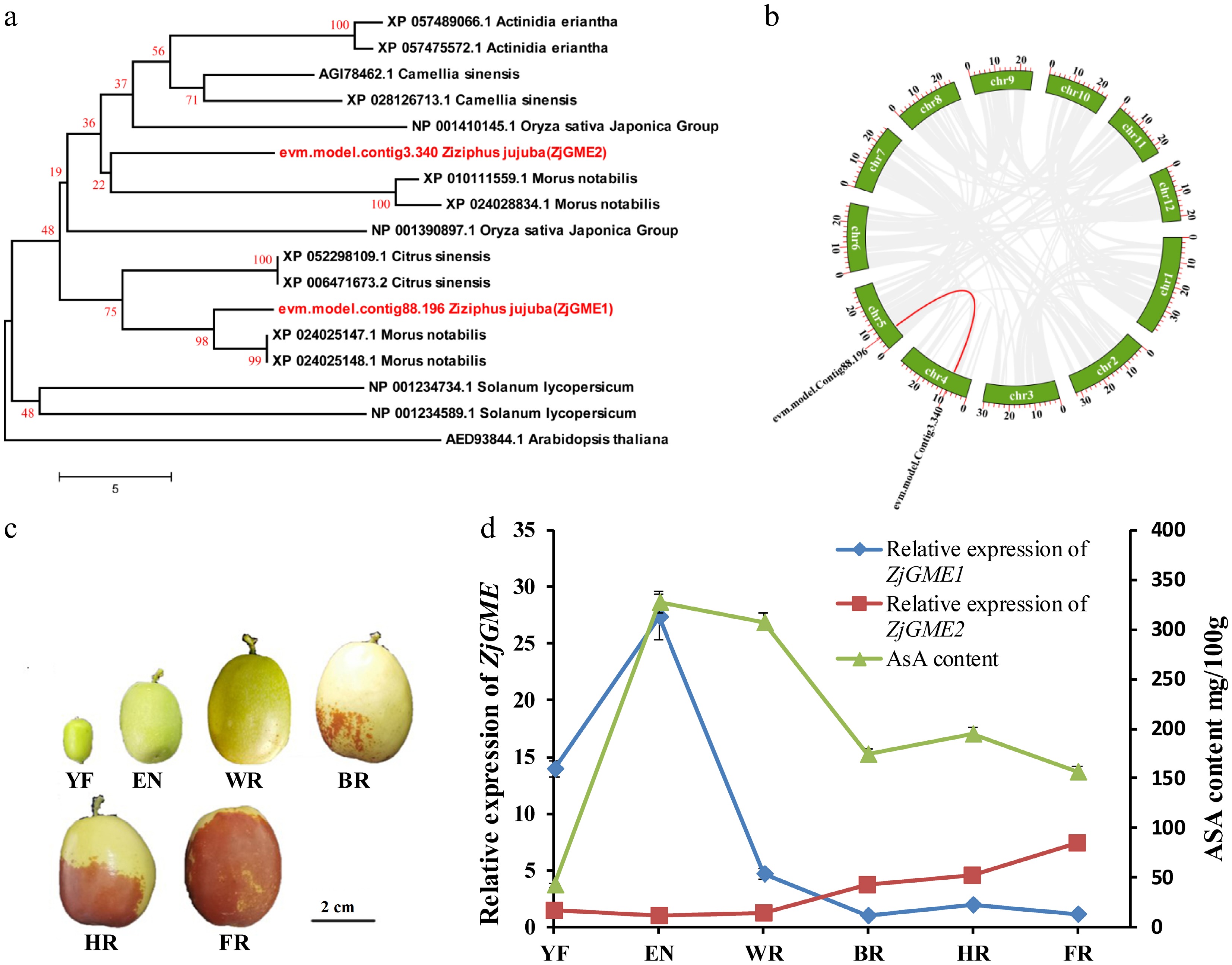 Phylogenetic evolution and expression of GME genes in jujube. (a) Phylogenetic analysis of ZjGMEs and homologous genes from Morus notabilis, Citrus sinesis, Oryza sativa, Camellia sinensis, Actinidia eriantha, Solanum lycopersicum, and Arabidopsis thaliana. (b) Collinearity analysis of the two jujube GMEs within the jujube genome. (c) Phenotypic characteristics of the jujube fruits during different development stages. Scale bar = 2 cm. (d) ZjGMEs (ZjGME1 and ZjGME2) mRNA abundance and AsA content at six fruit developmental stages. YF: young stage; EN: enlargement stage; WR: white mature stage; BR: early red stage; HR: half red stage; FR: full red stage.