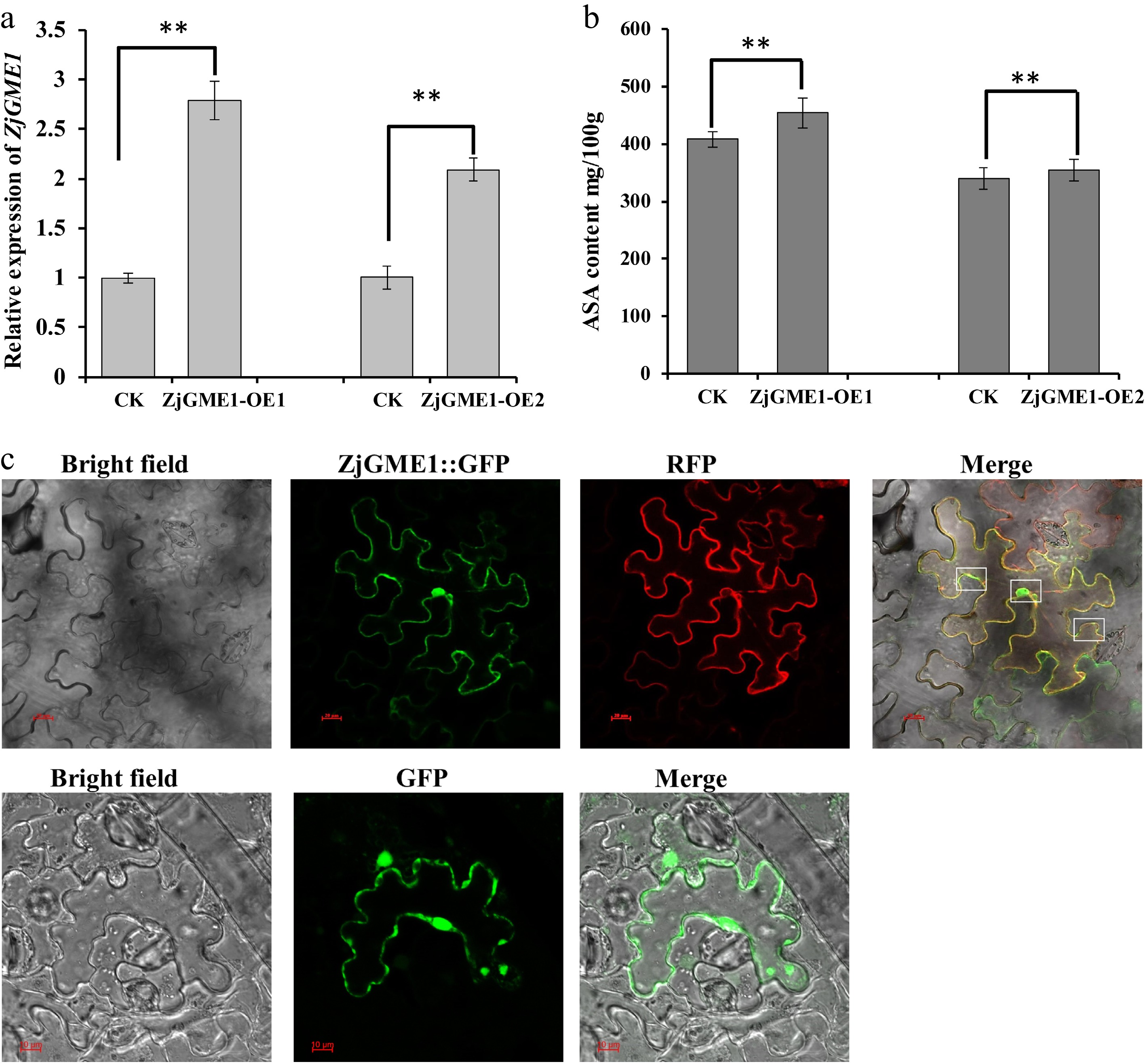 ZjGME1 overexpression enhances AsA accumulation and subcellular localization analysis