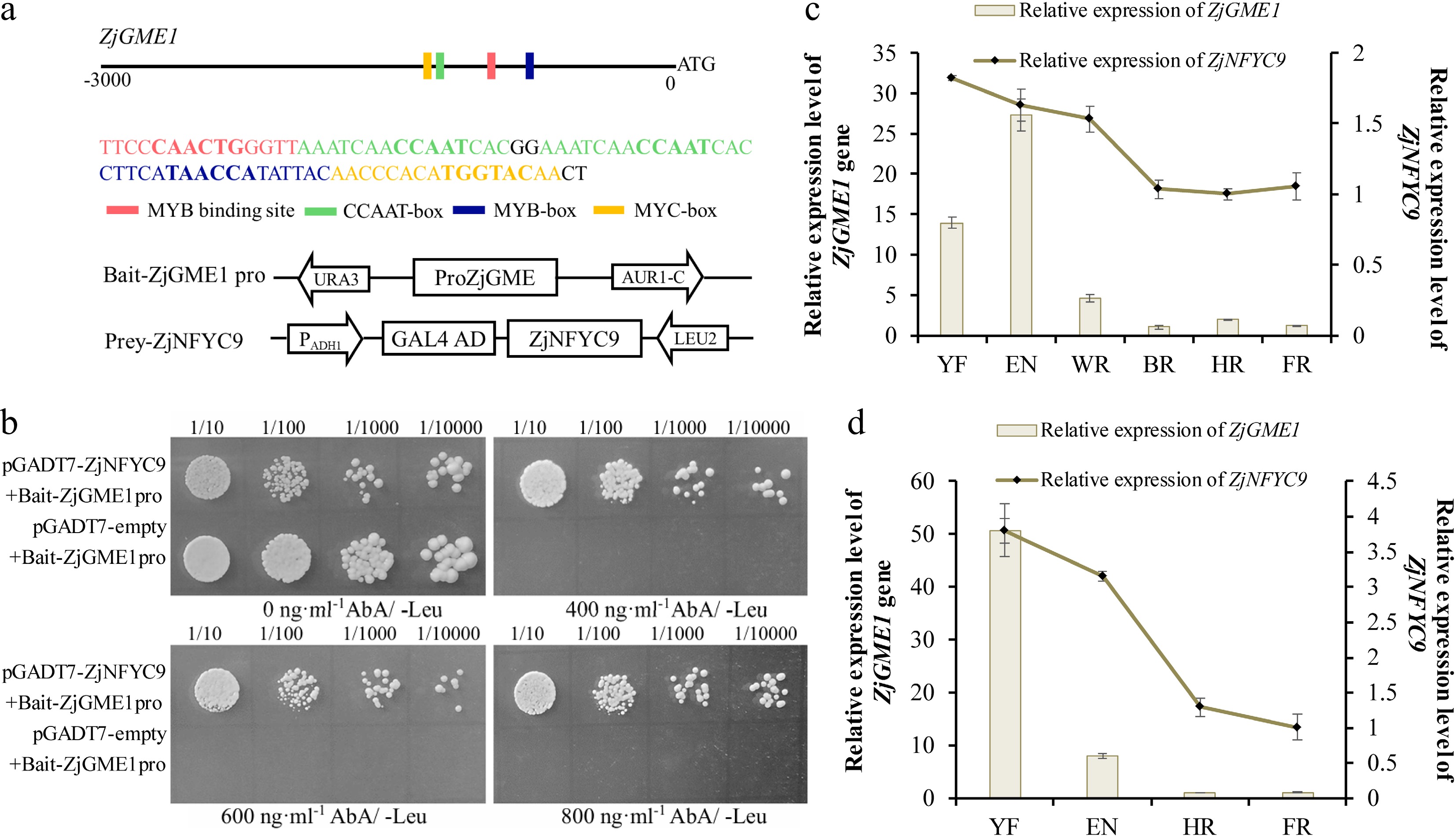 Binding of ZjNF-YC9 to the promoter of ZjGME1 from jujube. (a) Schematic diagrams of the bait and prey vectors that were used for the Y1H analysis. (b) Y1H assay of ZjNF-YC9 binding to the ZjGME1 promoter fragments of jujube. Yeast cells grown on SD/-Leu medium with different ABA concentrations (0, 400, 600, or 800 ng·mL–1). (c) and (d) Abundance of ZjNF-YC9 mRNA at different fruit development stages. YF: young stage; EN: enlargement stage; WR: white mature stage; HR: half red stage, FR: full red stage.