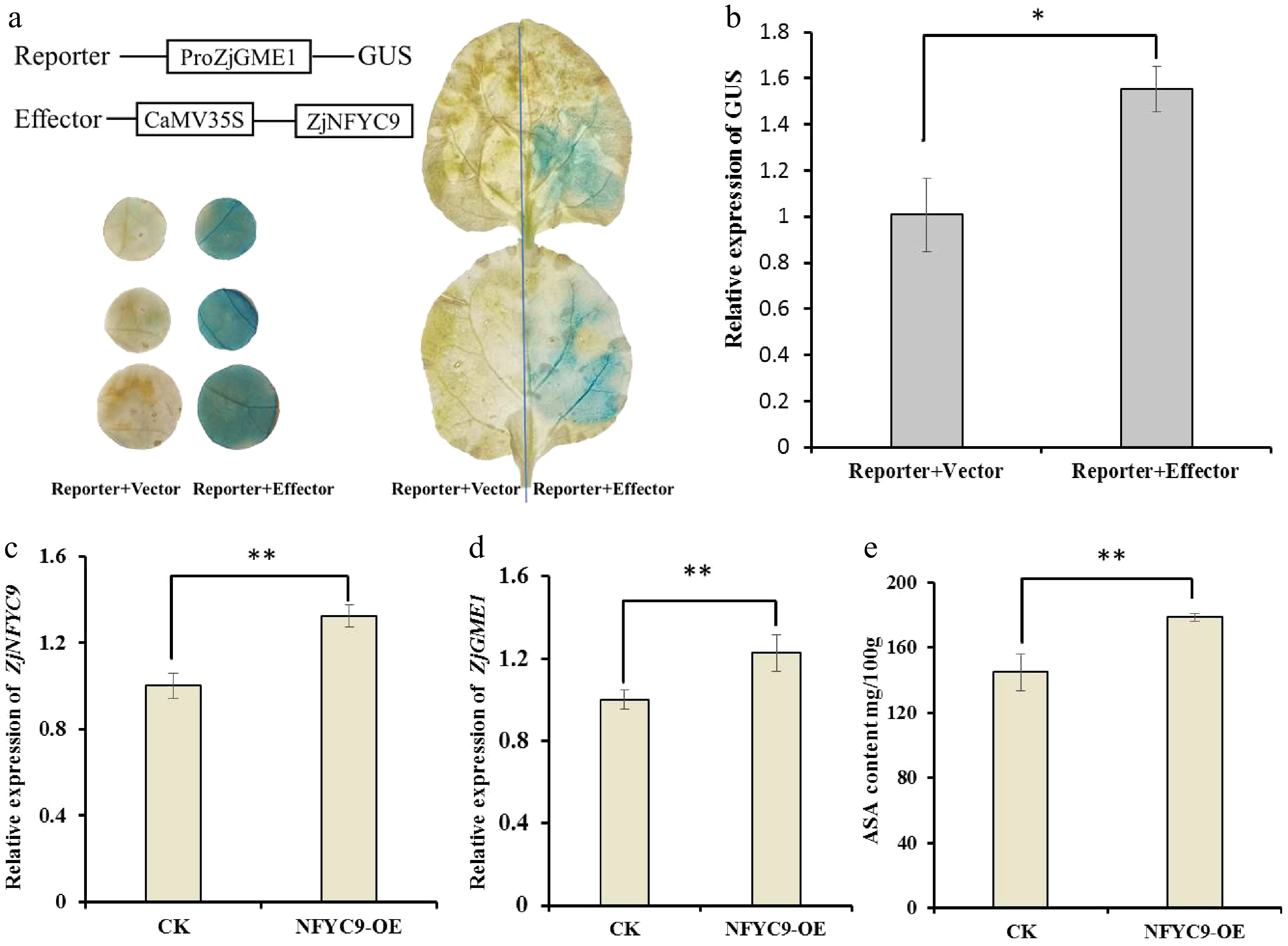 To further verify the binding of ZjNF-YC9 to the ZjGME1 promoter, we performed a transactivation assay in Nicotiana benthamiana using co-transformed pGreenII-62SK-ZjNFYC9 and P1300-proGME-GUS. GUS staining after 3 d revealed stronger blue staining in leaves expressing ZjNF-YC9 compared with the empty vector control (Fig. 4a). Quantitative analysis confirmed significantly higher GUS expression in the experimental group (Fig. 4b), supporting ZjNF-YC9-dependent transactivation. Finally, transient overexpression of ZjNF-YC9 in jujube fruit led to a 1.3-fold increase in ZjNF-YC9 expression, a concomitant 0.2-fold up-regulation of ZjGME1, and a 24% rise in AsA content relative to the control (Fig. 4c–e). These results demonstrate that ZjNF-YC9 positively regulates ZjGME1 expression and enhances AsA accumulation.