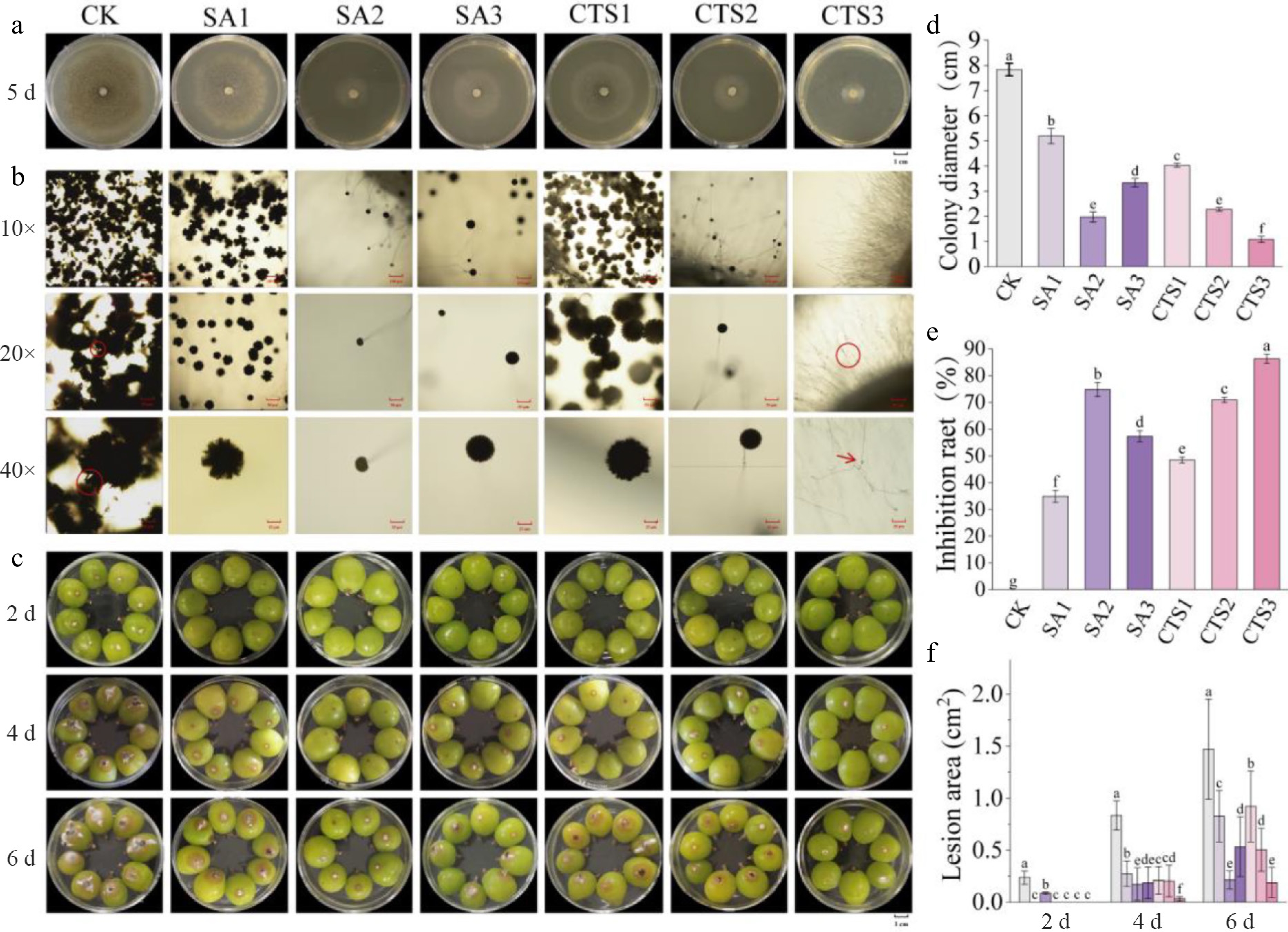 Antifungal activity of SA and CTS against Aspergillus niger. (a) Inhibition of A. niger mycelial growth by SA and CTS; (b) effects of SA and CTS treatments on microscopic morphology of A. niger spores; the arrow is pointing to a pathological nodule. (c) To observe pathogenicity, grapes were inoculated with A. niger; (d) colony diameter; (e) inhibition rate; (f) lesion area. Data is presented as mean ± SD, n = 3. Different letters indicate significant (p < 0.05) differences between the control and treated samples.