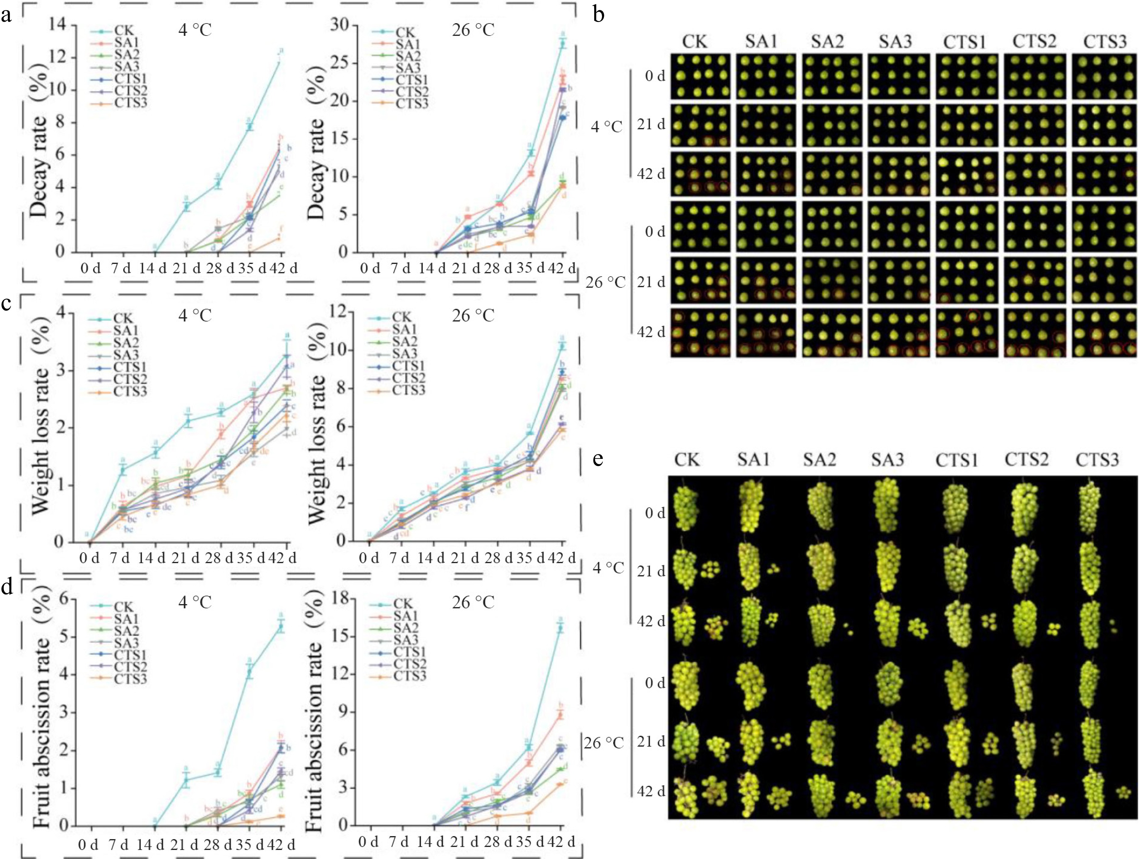 • Grape FAR exhibited a progressive increase throughout the storage period (Fig. 2e). After 42 d, the efficacy of the treatments was temperature-dependent. At 4 °C, the FAR across groups followed the descending order: CK > SA1 > CTS1 > CTS2 > SA3 > SA2 > CTS3. In contrast, at 26 °C, the SA2 and CTS3 treatments resulted in the lowest FAR values (4.5% and 3.3%, respectively; Fig. 2d). Notably, the CTS3 treatment consistently demonstrated the greatest efficacy in minimizing fruit abscission at both storage temperatures.