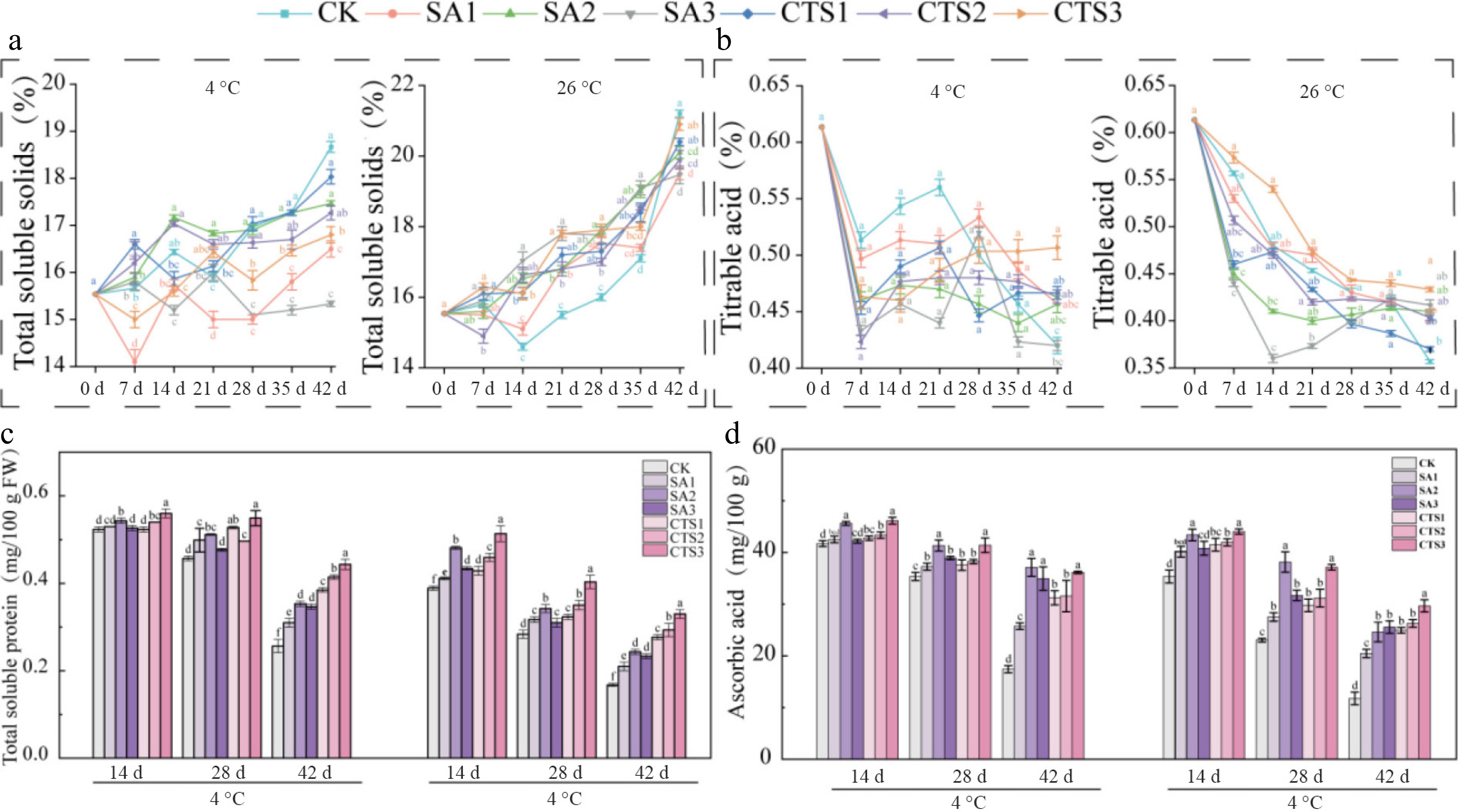 • TSP, a key biochemical marker associated with fruit disease resistance, ripening, and senescence, decreased during storage across all treatments (Fig. 3c). At 4 °C, the CTS3 treatment maintained the highest TSP content (0.44 mg/100 g) after 42 d, which was significantly higher than that in other treatments. At 26 °C, CTS3 resulted in the highest TSP content (0.33 mg/100 g) after the same period, differing significantly from the other groups. The CK group showed the most rapid decline in TSP. Both SA and CTS treatments significantly retarded TSP degradation compared with CK. These results suggest that the efficacy of all experimental treatments is temperature-dependent: it helps preserve protein content by inhibiting hydrolase activity at 4 °C, whereas at 26 °C, accelerated metabolism likely outweighs the protective effect. Again, CTS3 resulted in the highest TSP at both temperatures.